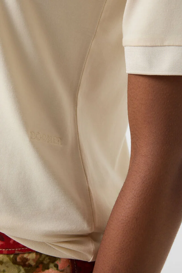 Тениска в прав силует, кръгла яка от еластична материя, къси ръкави с еластични оребрени маншетиЮ