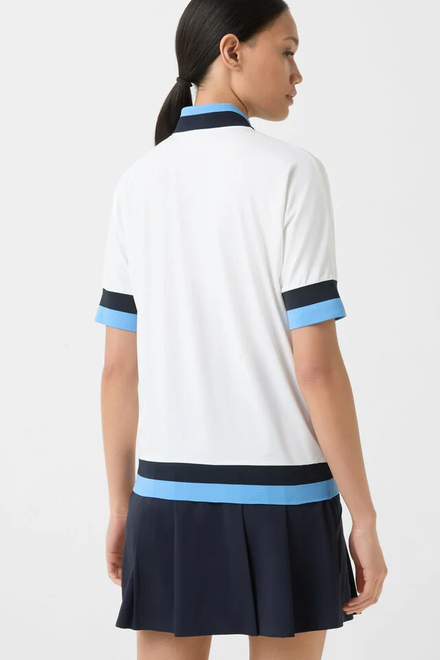 Оребрената поло яка с къс B-цип добавя уникален акцент, докато късите ръкави с изрязаните рамене придават динамичен, актуален вид