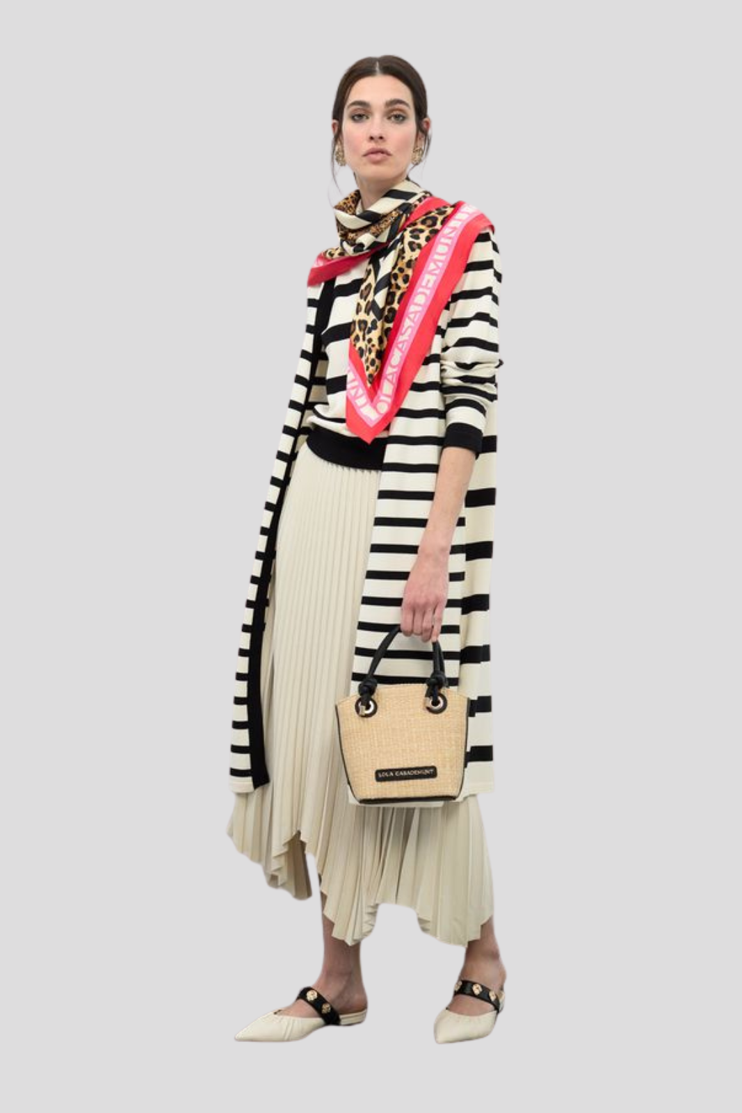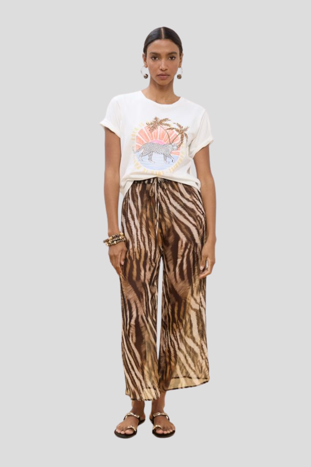 Тениска в класически силует, декорирана с изразителен животински принт и деликатни мотиви на палмови дървета — съвършено съчетание на непреходна форма и екзотична индивидуалност