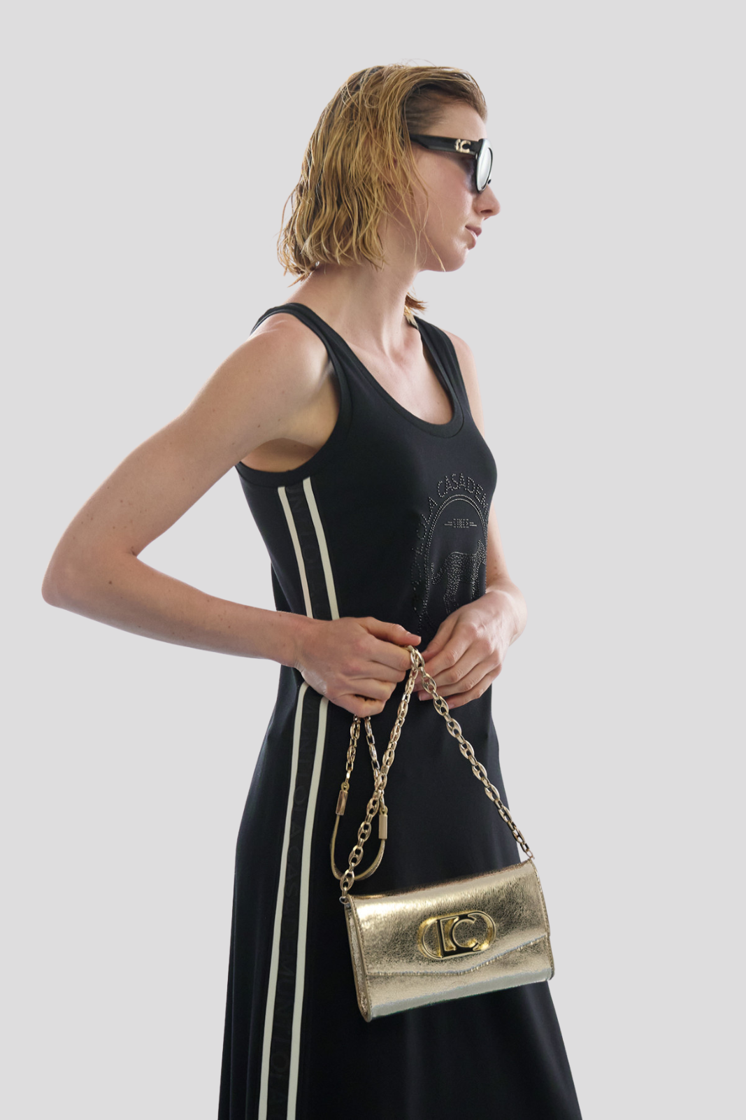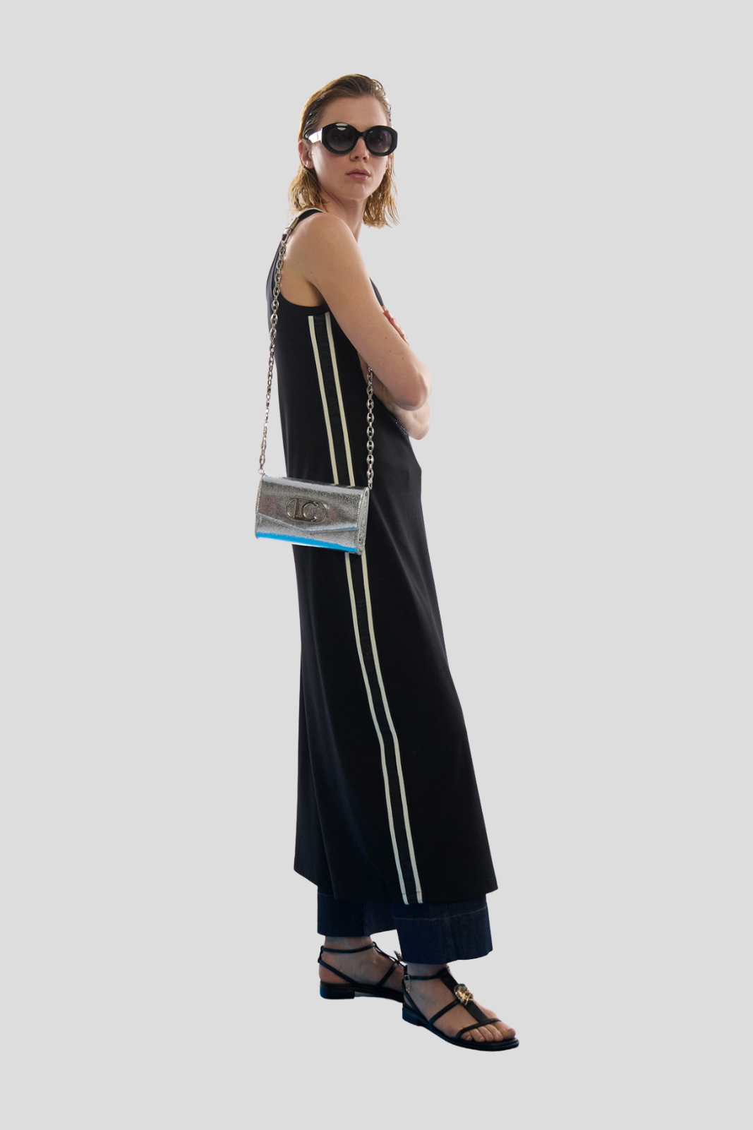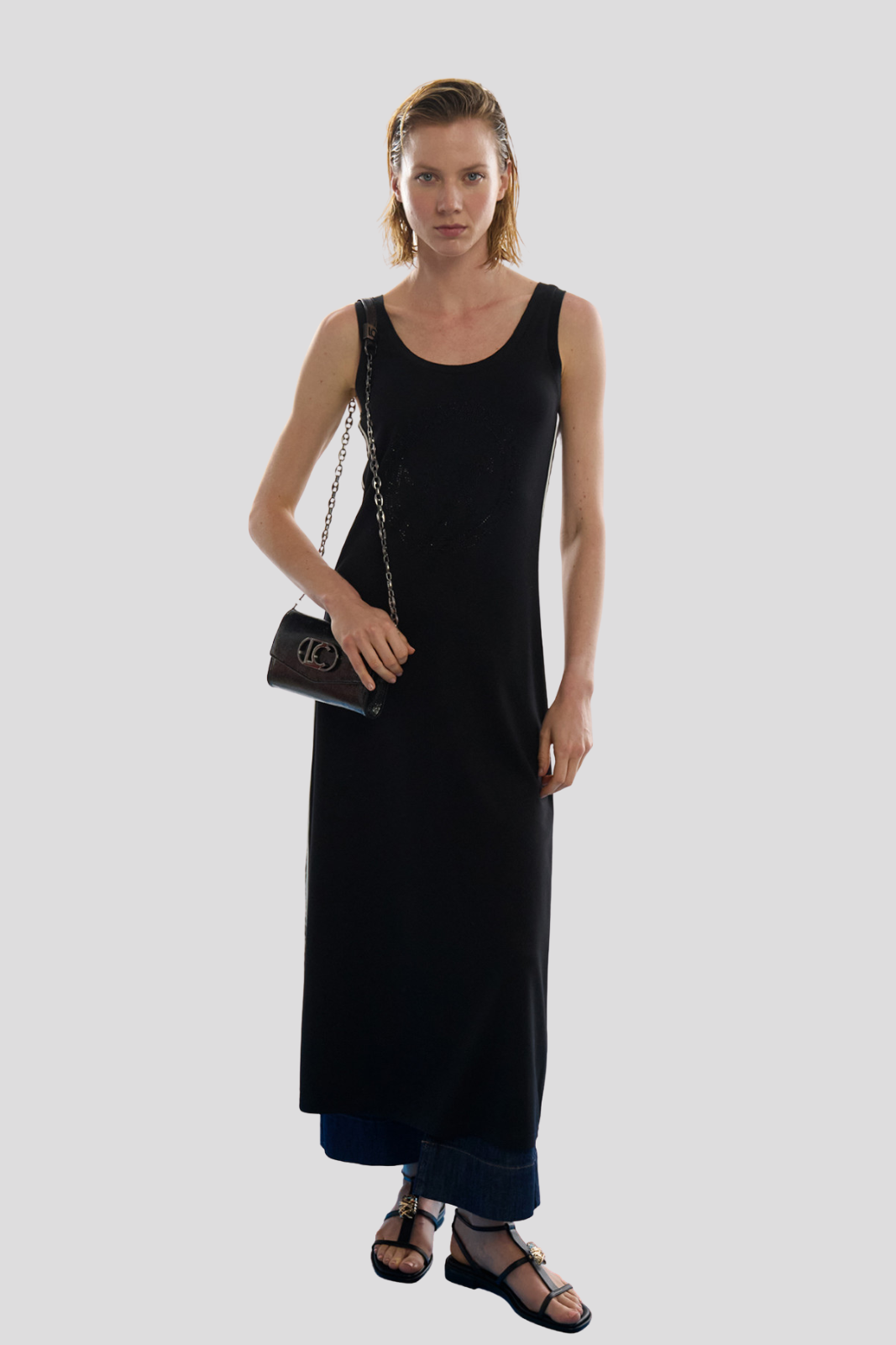 Дълга, вталена черна рокля със странични ленти, създаващи визуално издължаващ и оптически прав силует