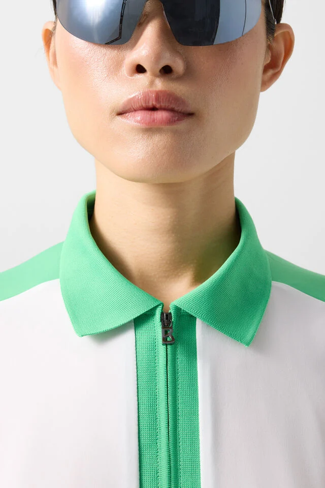 Оребрената поло яка и късите ръкави с ребрени плетени маншети придават елегантна структура, докато късият B-цип и спуснатите рамене добавят модерна непринуденост