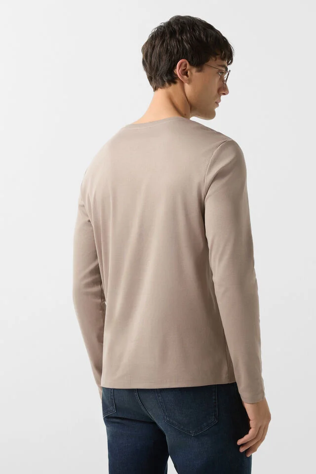 Кръглото деколте придава модерен и непретенциозен силует, подходящ както за самостоятелно носене, така и като основен слой под сако или яке
