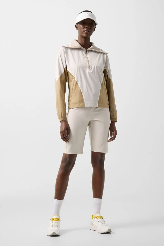 Дългите ръкави с еластични маншети и леко спуснатите рамене осигуряват свобода на движение, докато късият B-цип и двата скрити джоба с цип добавят практичност