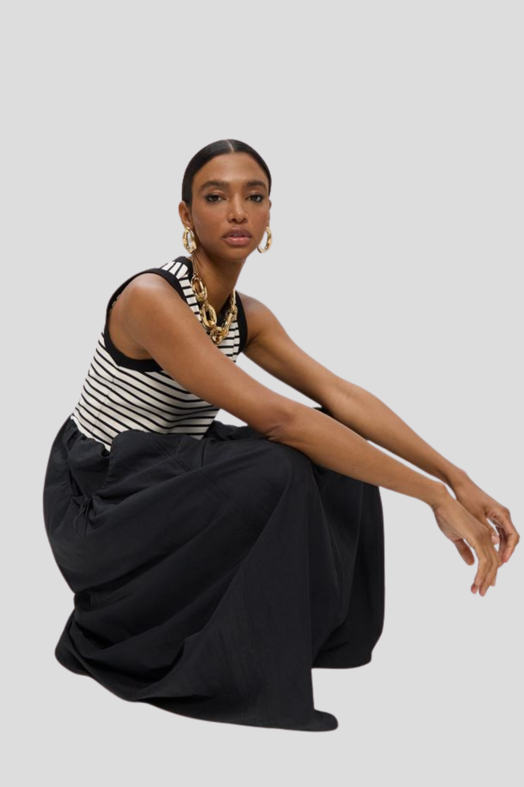 Рокля с изящен райе десен, която съчетава елегантност и съвременна лекота в изчистен силует. Деликатните линии на мотивите придават визуален ритъм и стил, подчертавайки фината хармония между форма и детайл, за изискано и модерно излъчване във всяка визия.