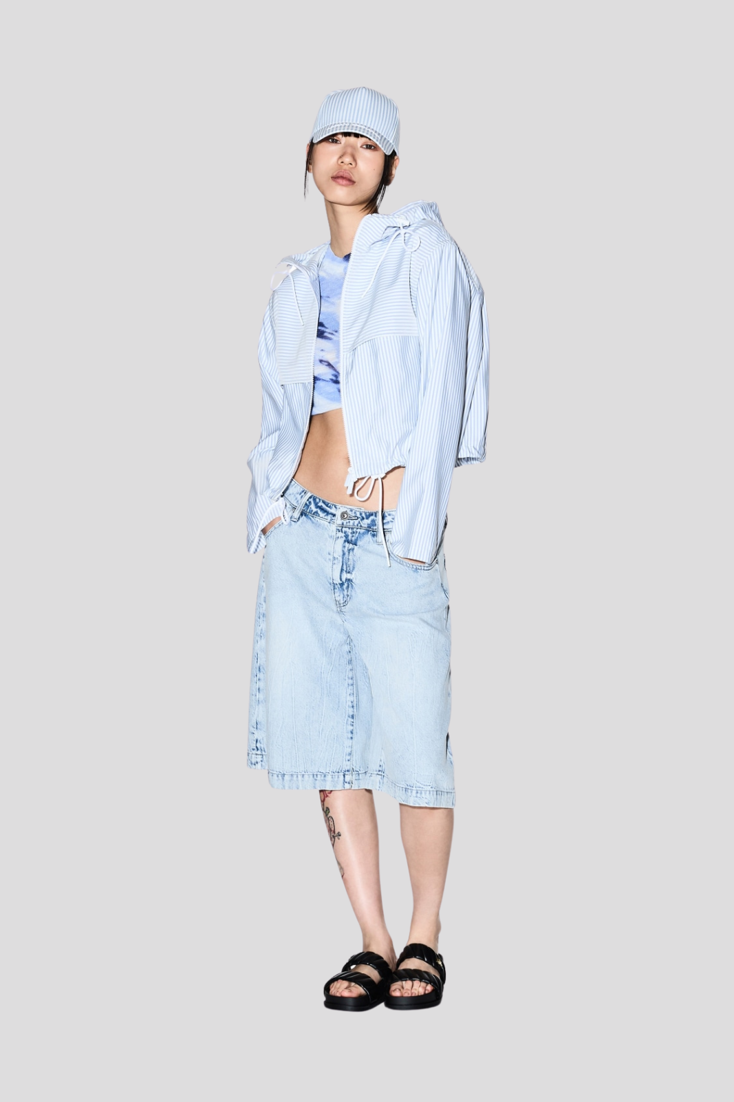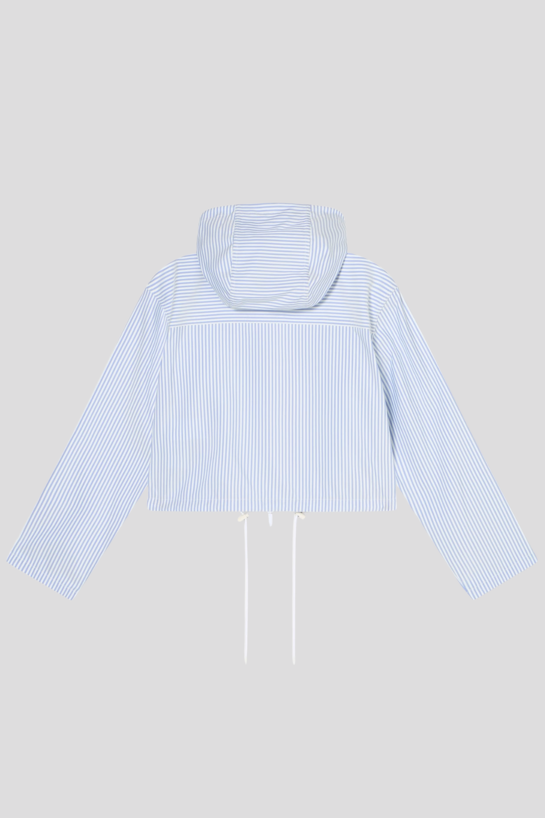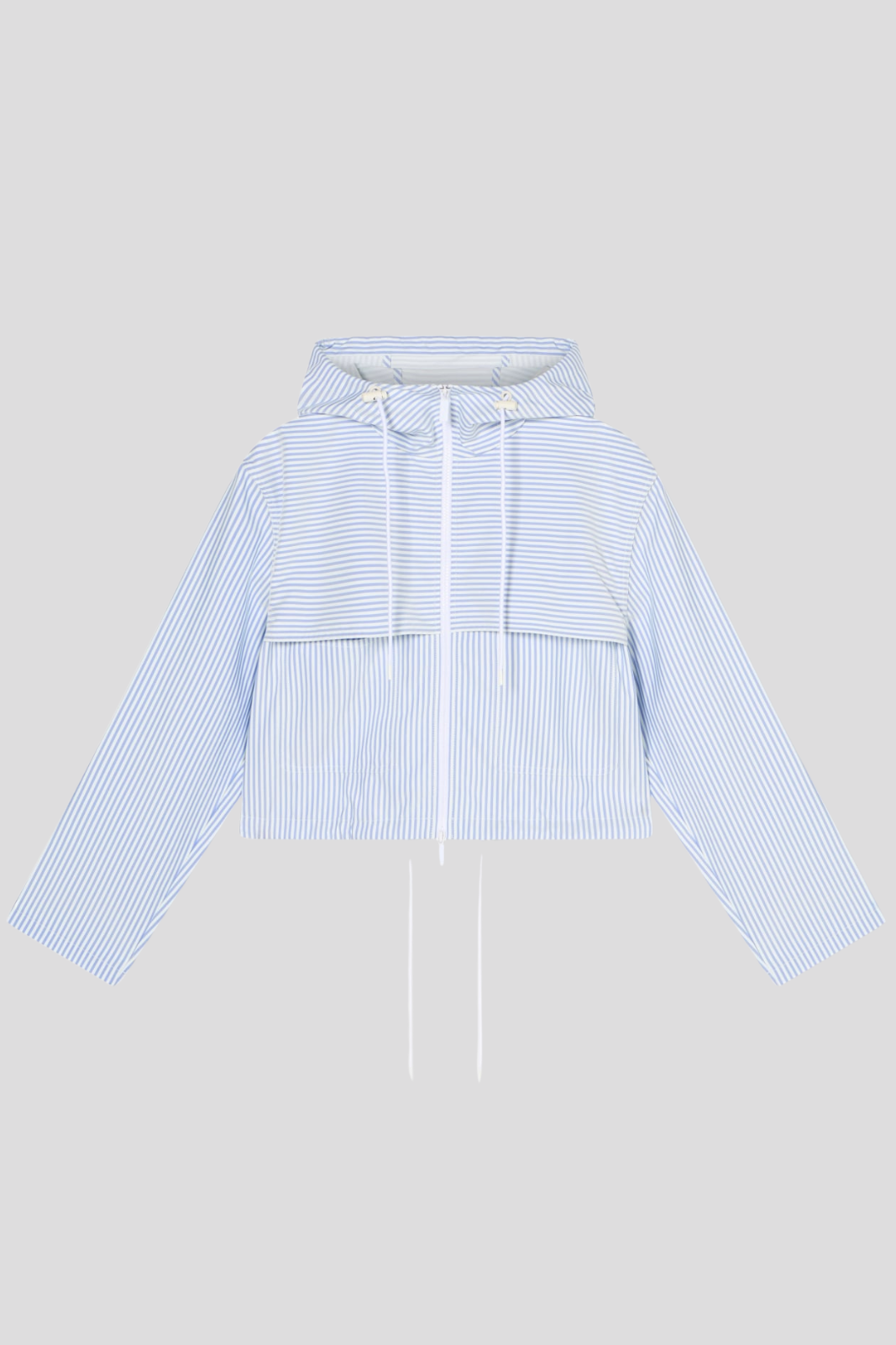 Яке в прав силует, което привлича погледите с едрите си райета – почит към класиката, преразгледана с мисъл за устойчивост