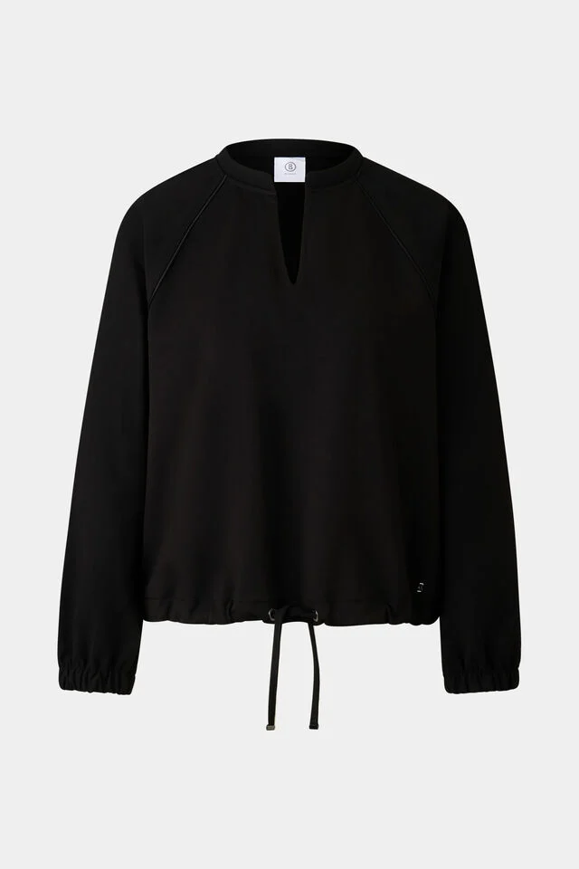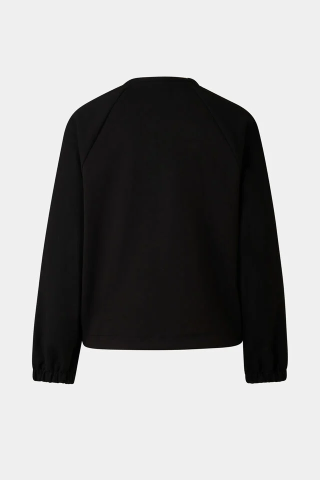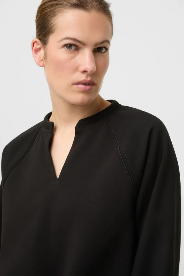 Суитшърт с прав силует, подсилена кръгла яка с малко V-образно деколте, дълги ръкави реглан с декоративни шевове в тон и еластични маншети на ръкавите