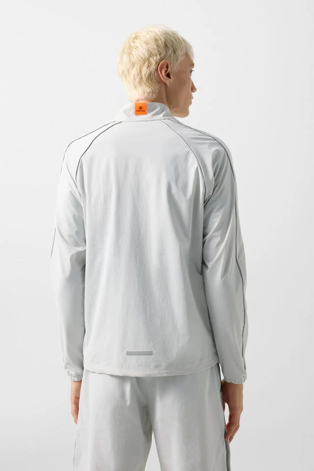 Яке с прав силует и стойка яка, дълги реглан ръкави с еластични маншети и двупосочен цип