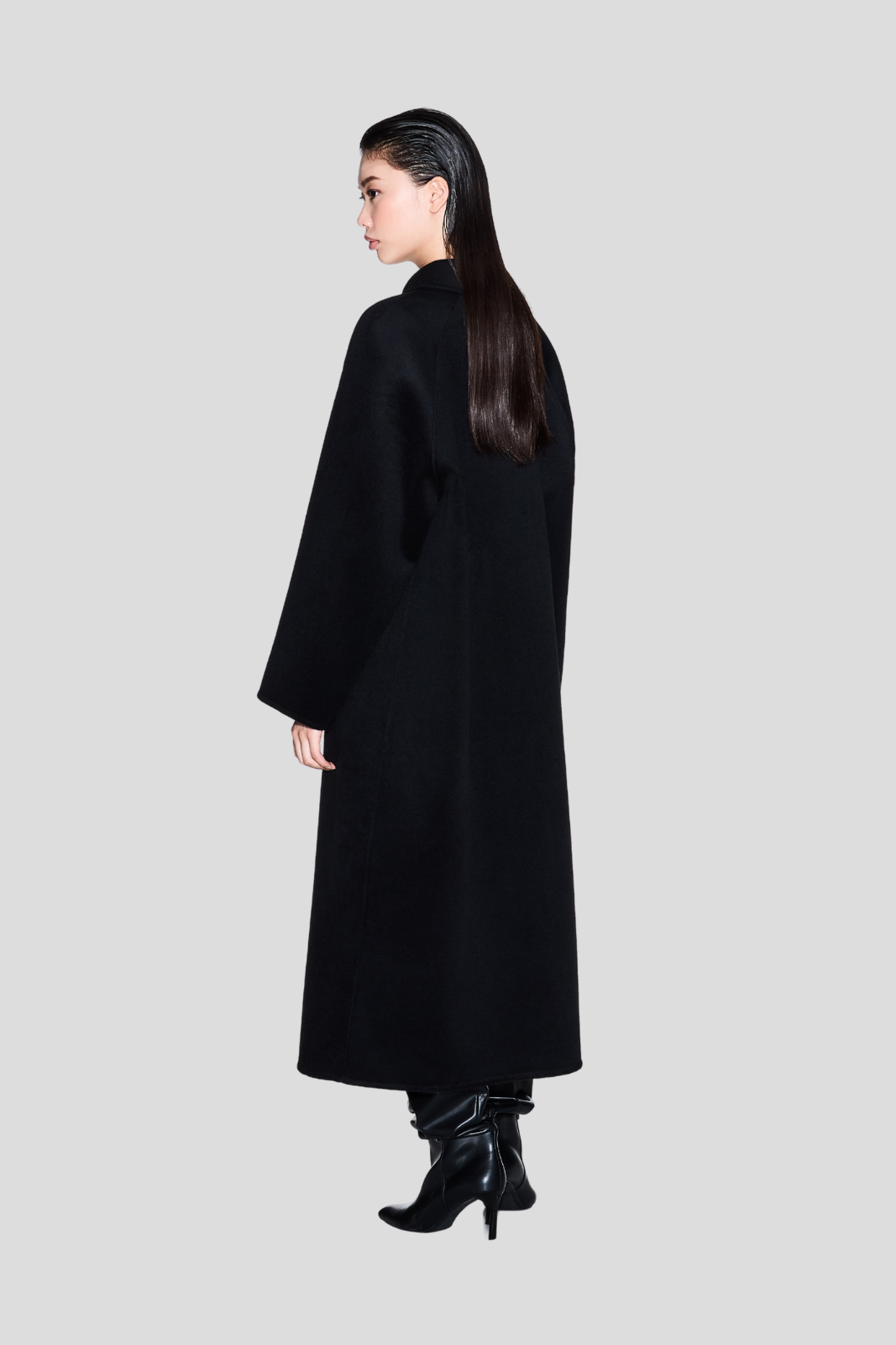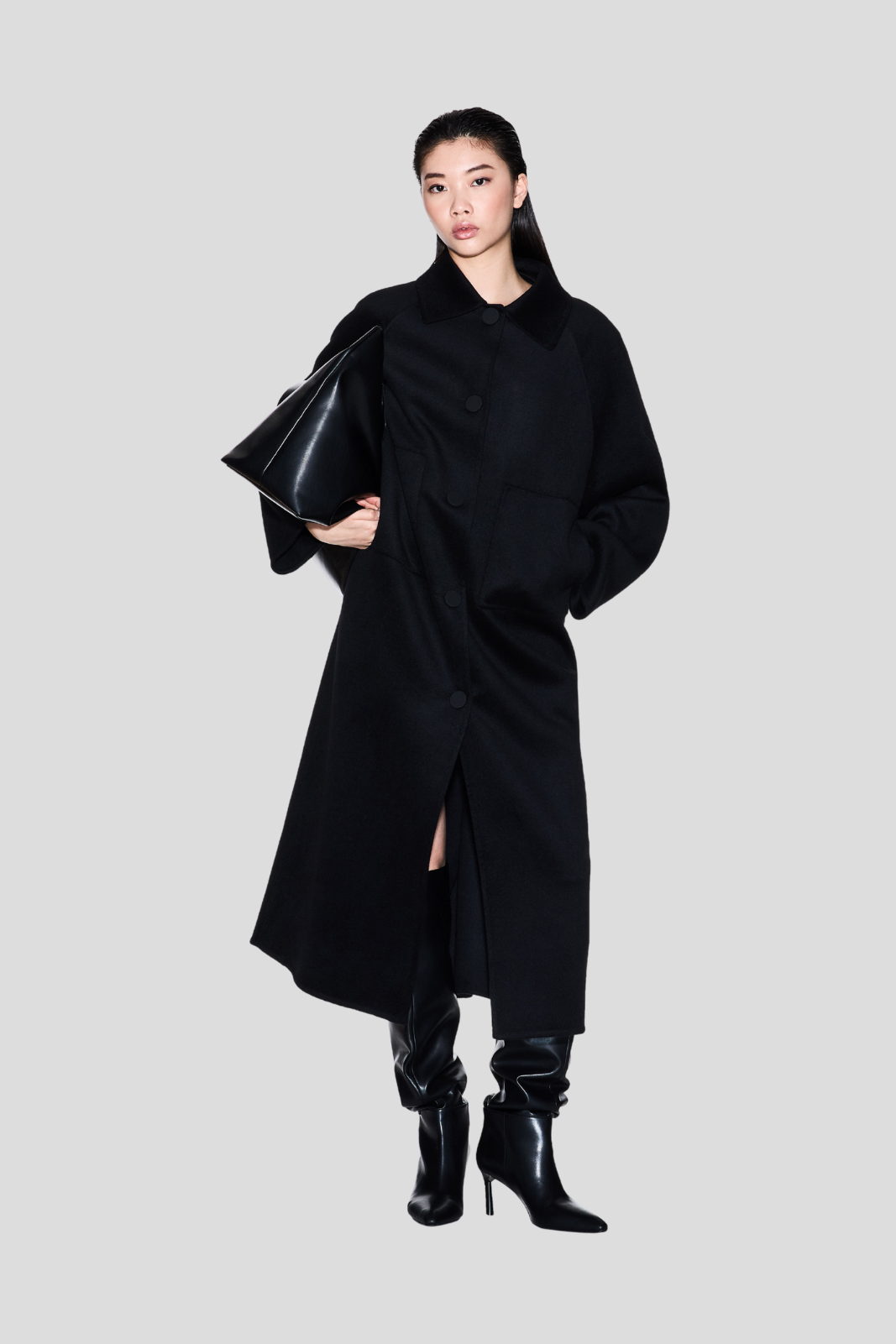 Дамско палто в изтънчен класически силует, подчертано от елегантни детайли и изящно закопчаване с копчета.