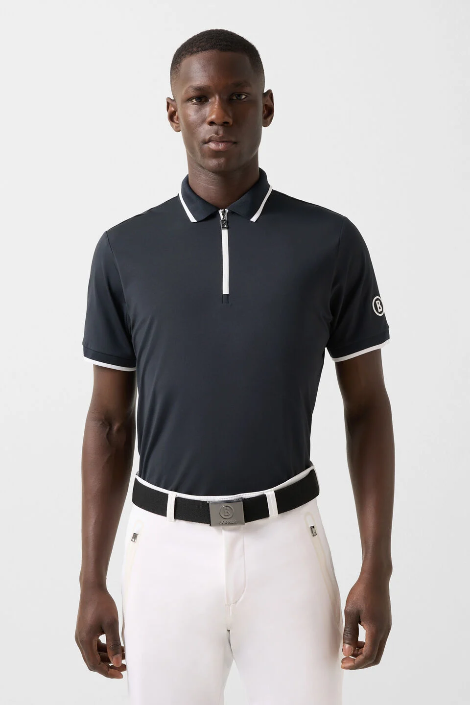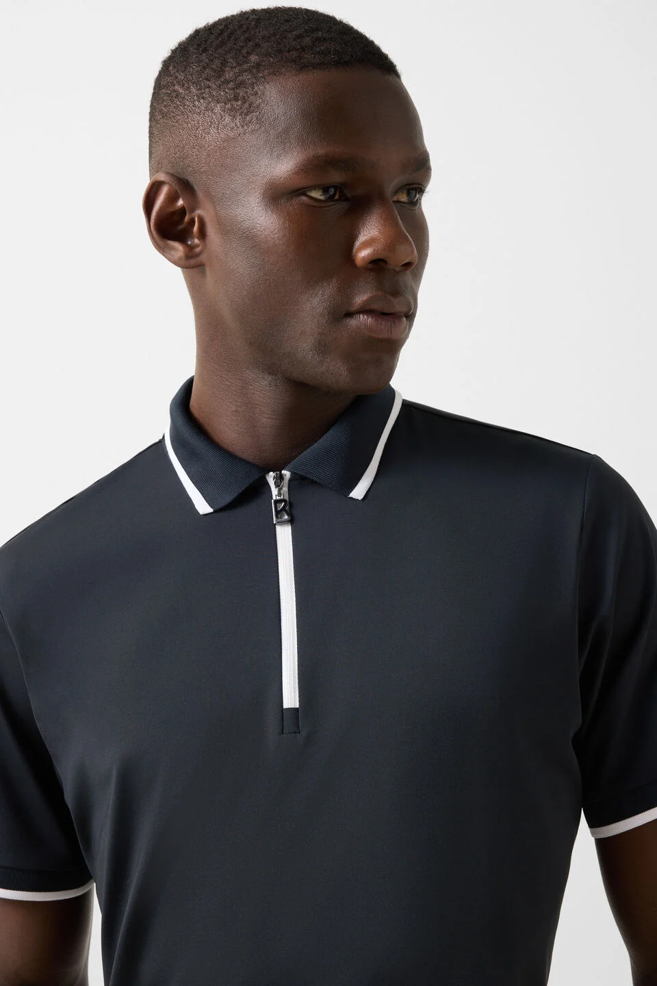 Поло тениска в класически силует и елегантно излъчване, допълнена от фино оребрена поло яка и къси ръкави