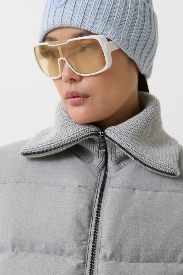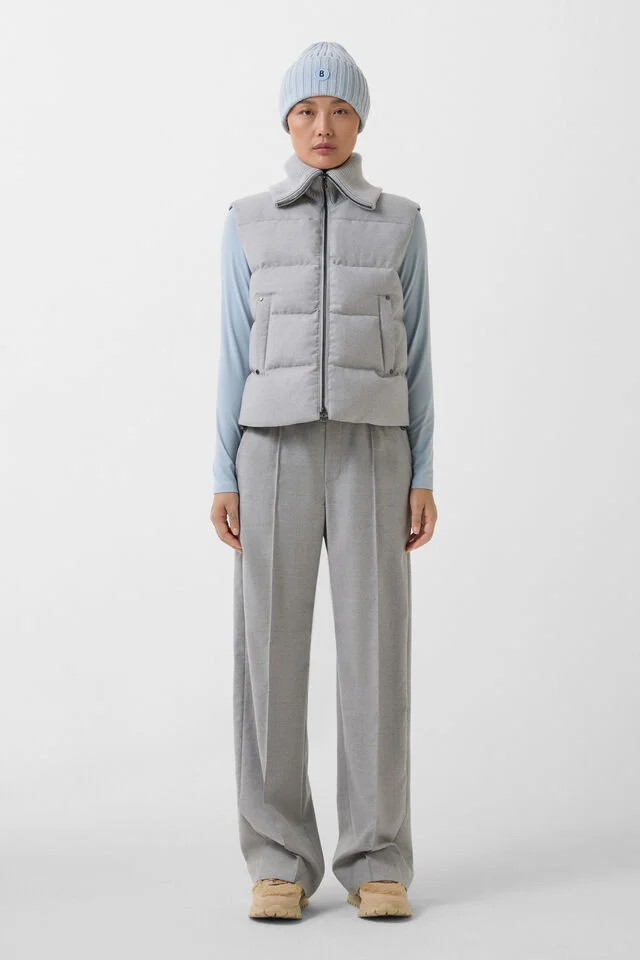 Плетената изправена яка придава изискан акцент, а чистите отвори за ръкави подчертават минималистичната линия