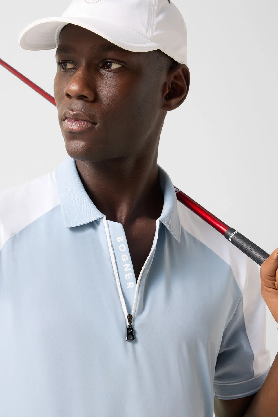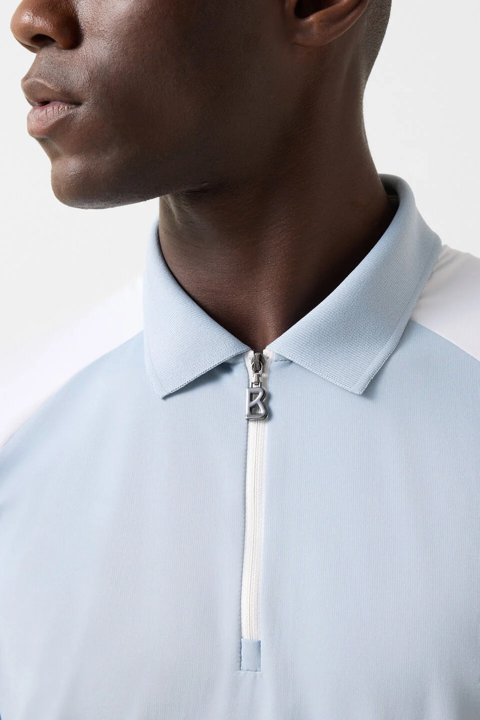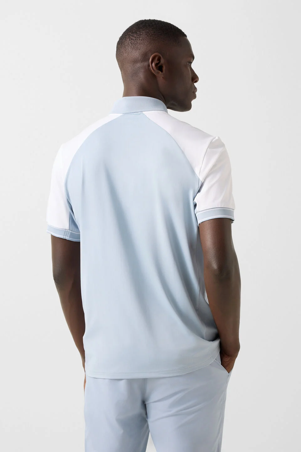 Поло риза в прав силует, с контрастни секции и странични пике вложки, оребрена поло яка, къси ръкави, оребрени маншети, къс B-цип
