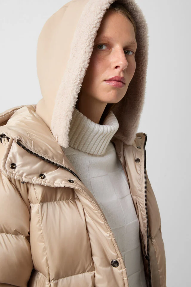 Плаващата подплата с дизайн от букви и водоотблъскващото покритие подчертават модерната функционалност, а затоплящата подплата от естествен патешки пух гарантира комфорт