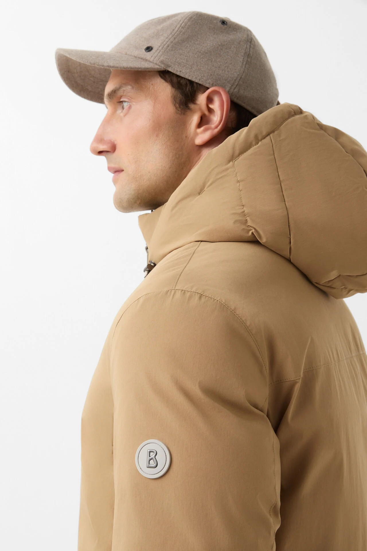Елегантен модел с изправена яка с оребрена вложка и фиксирана качулка с връзки за стягане, релефни стопери и капси BOGNER за перфектно прилягане