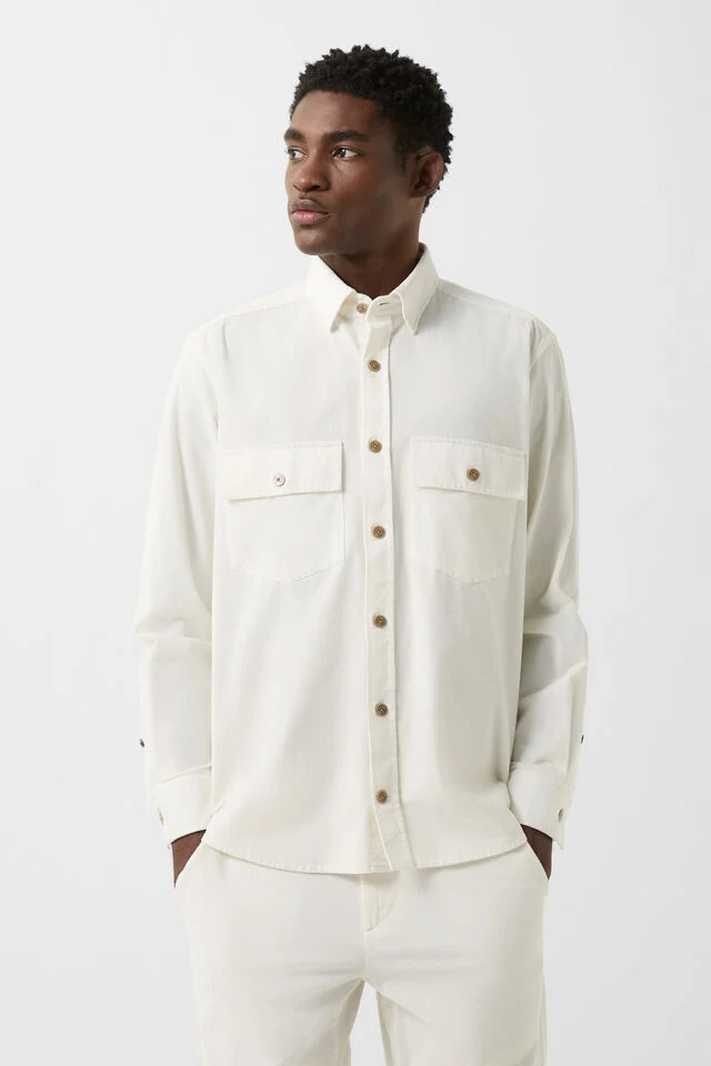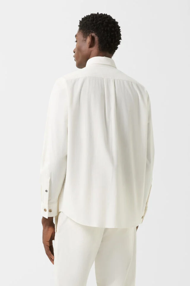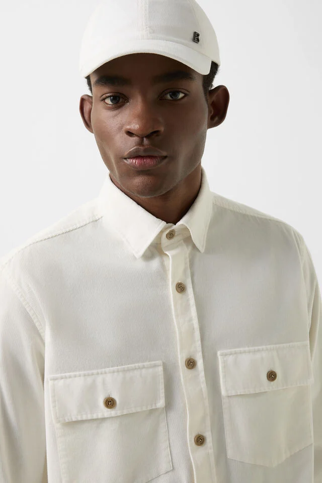 Риза в класически силует, изработена от италиански baby corduroy, с яка тип button-down със скрито закопчаване, подчертаваща изчистената и елегантна визия