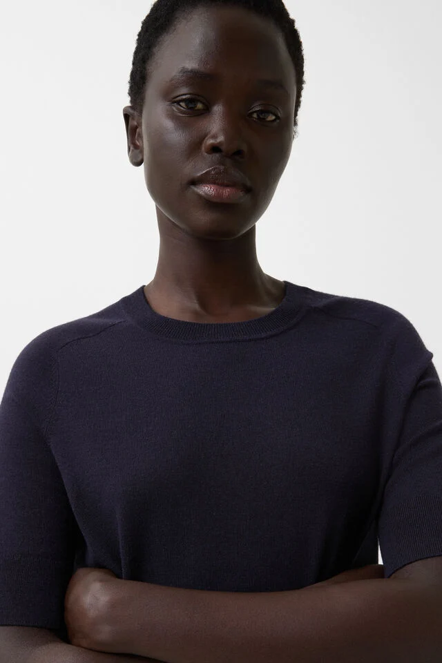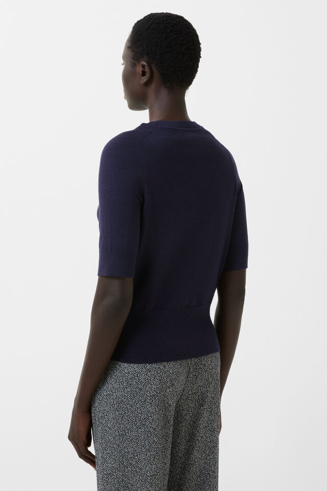 Дамски пуловер с къс ръкав и класически силует, който съчетава елегантна простота с изразителни детайли