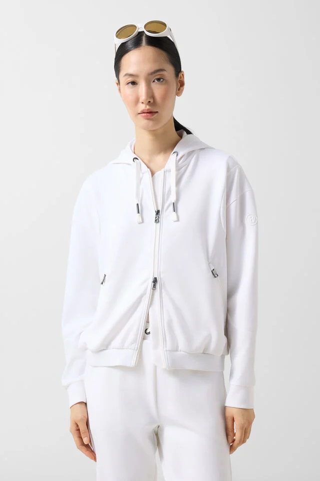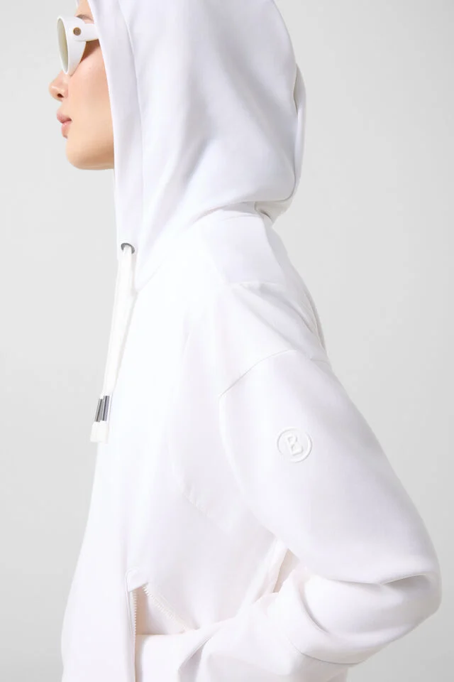Фиксираната качулка с фини връзки за стягане е акцентирана с елегантна grosgrain панделка и метални BOGNER детайли, които подчертават луксозния характер на модела