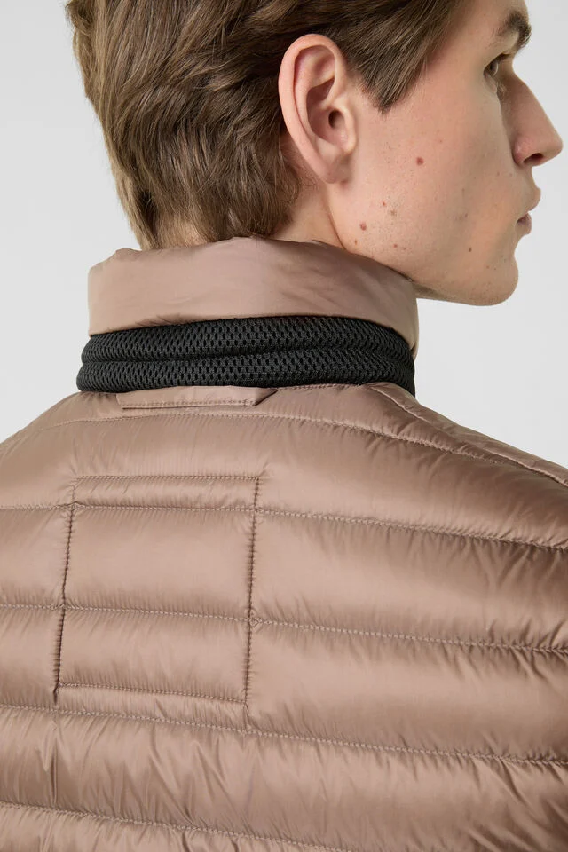 Ватиран пухен елек в класически силует, подплатена яка с контрастна мрежеста вложка и отвори за ръкави на гърба с еластичен маншет с лого