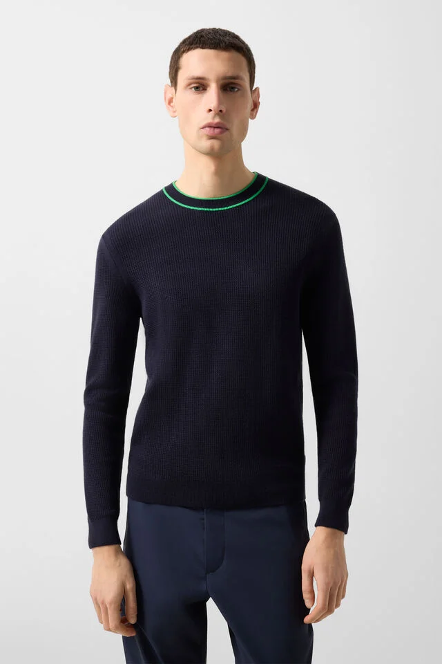 Кръгло деколте с контрастни раирани детайли
