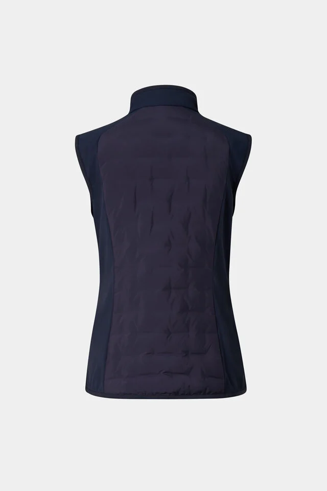 Хибриден жилет с класически силует и ватирани секции, допълнен от подплатена яка с изправена линия, противоветрови отвори с тесни маншети и подложен двупосочен цип с B етикет