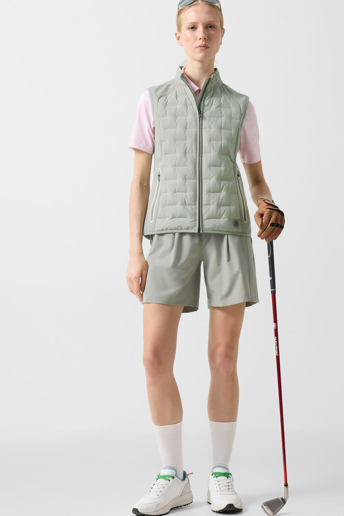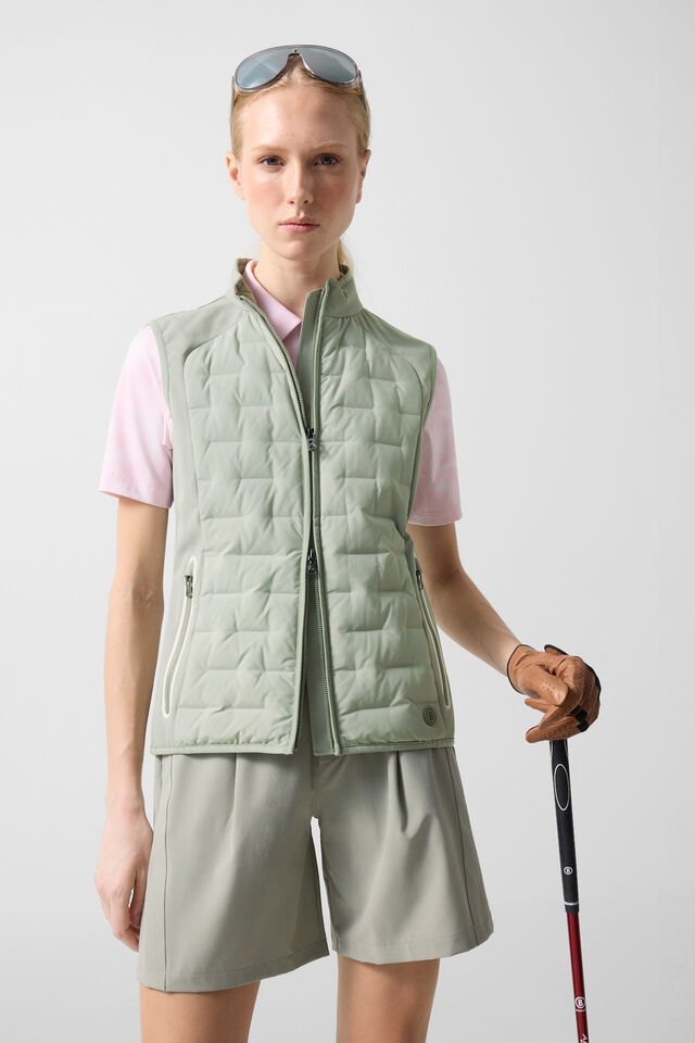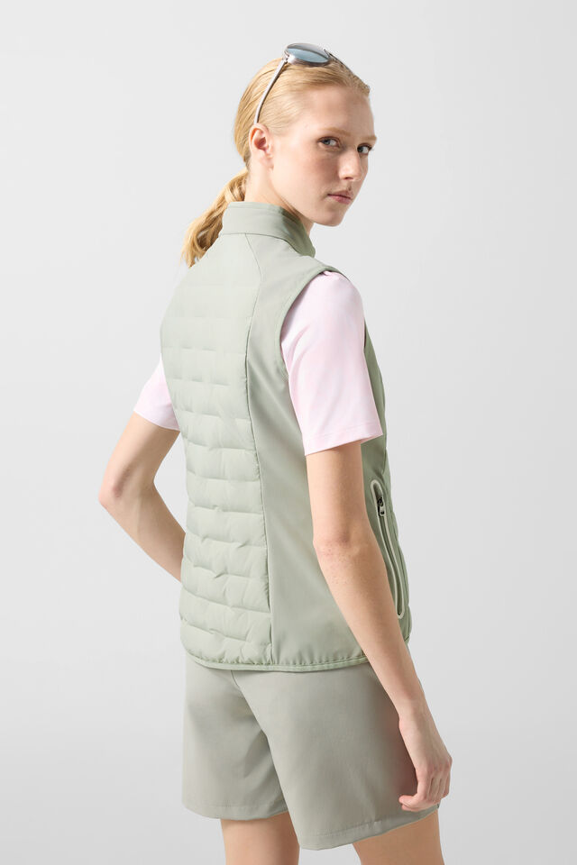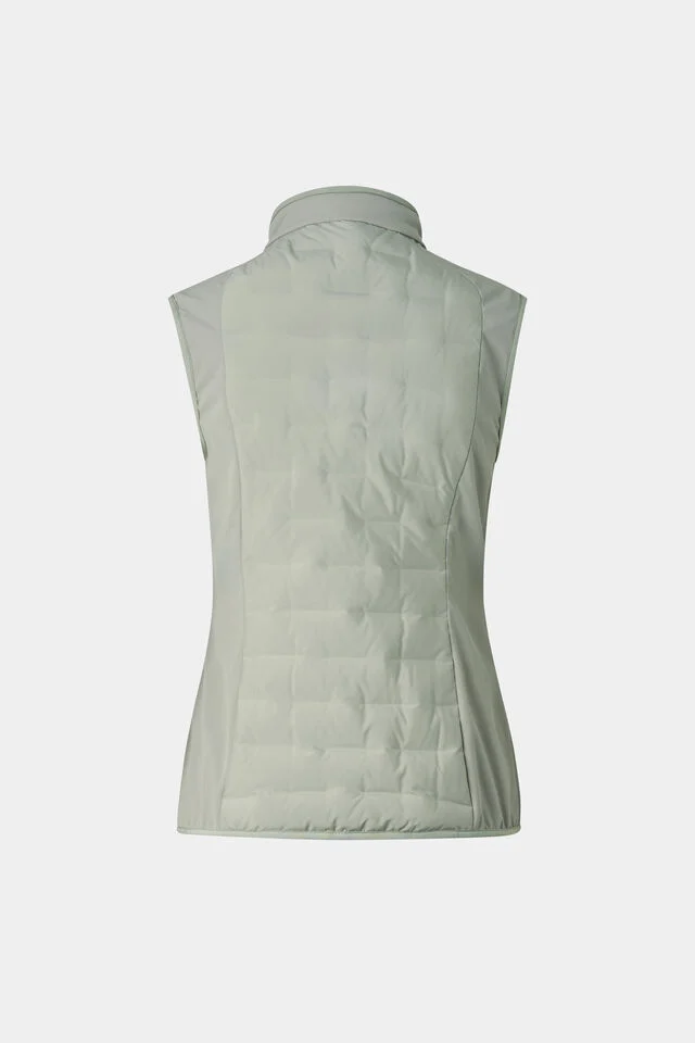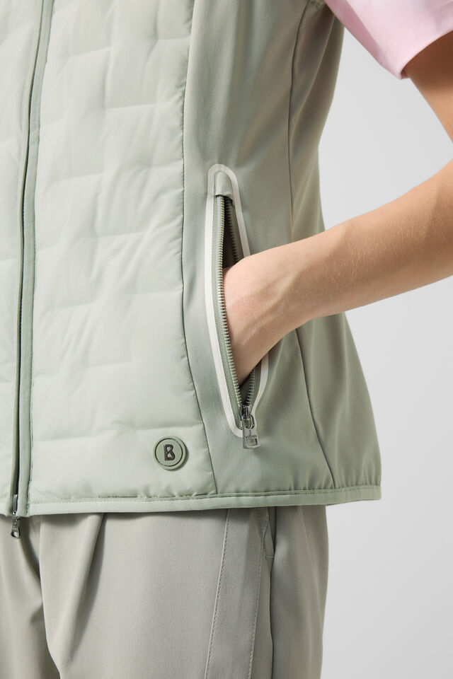 Хибриден жилет с класически силует и ватирани секции, допълнен от подплатена яка с изправена линия, противоветрови отвори с тесни маншети и подложен двупосочен цип с B етикет