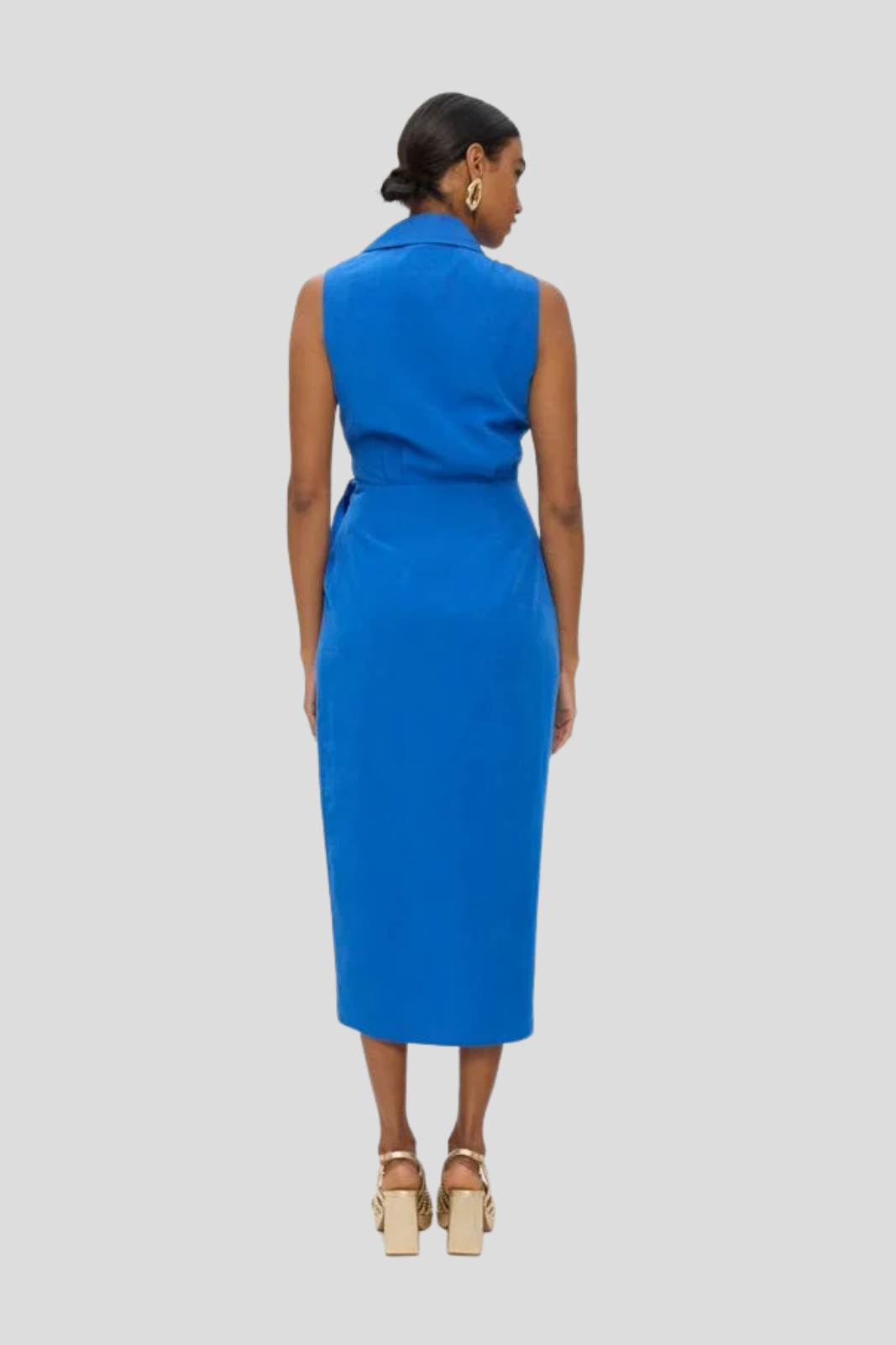 Рокля от лен с яка тип риза в изискан класически силует, подчертана с елегантен страничен възел — хармонично съчетание на лекота, структурираност и фин декоративен акцент