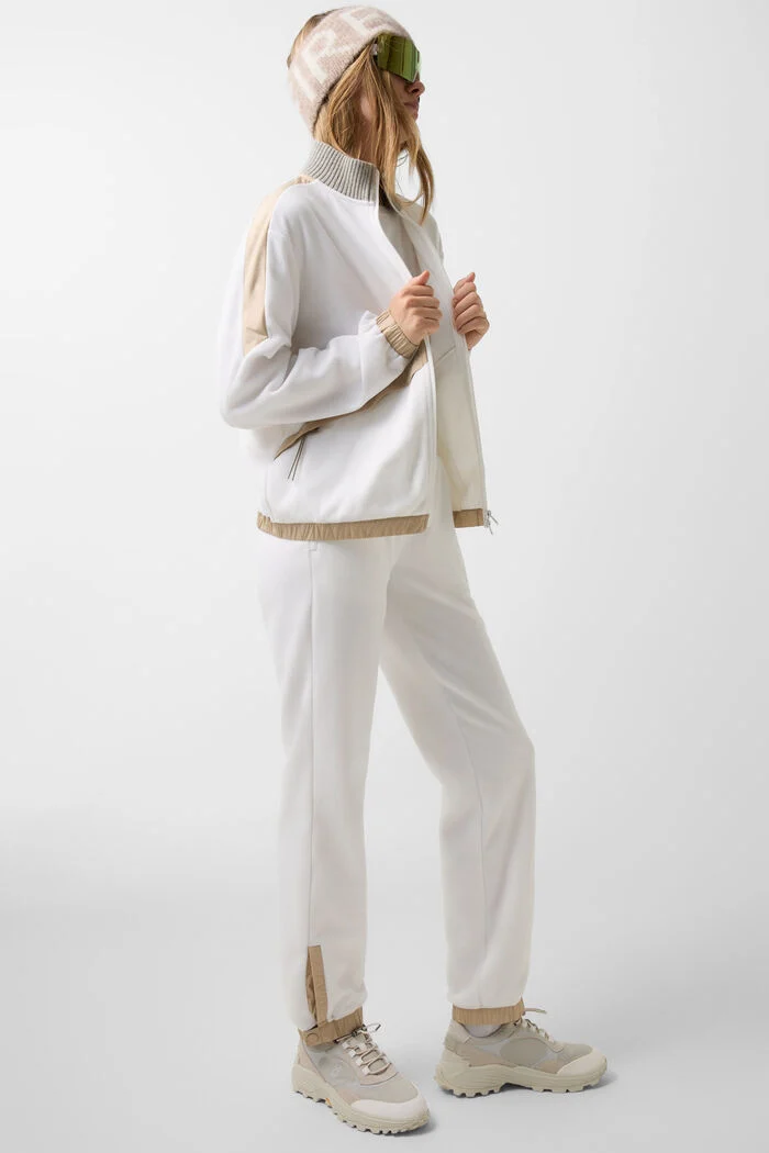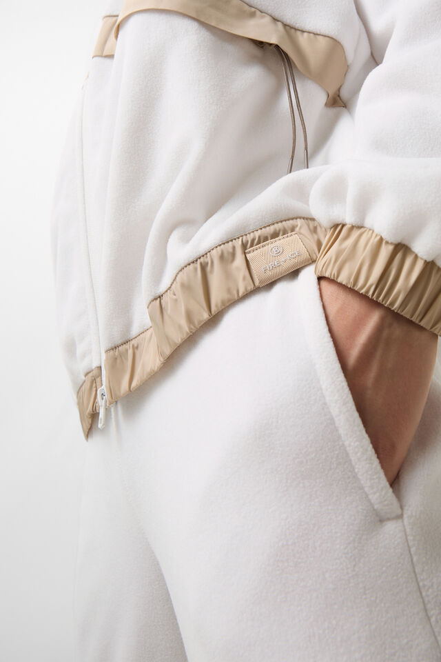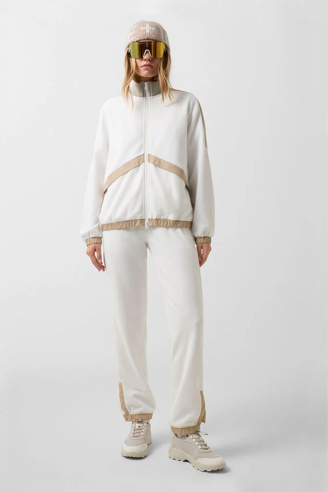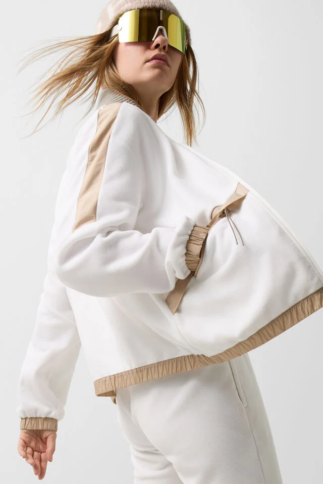 Контрастни найлонови секции подчертават модерния силует, а ребрена плетена яка с изправена талия осигурява топлина и елегантна линия