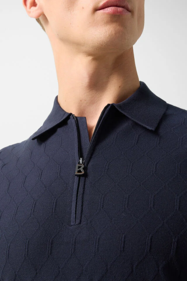 Оребрена поло яка, къси ръкави, оребрени маншети, къс скрит B-цип, гумена лепенка с лого на подгъва