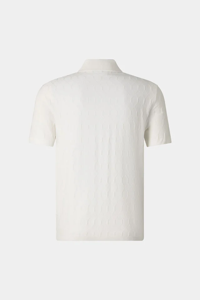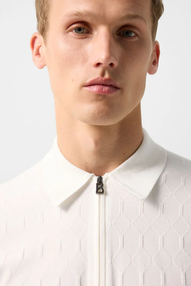 Оребрена поло яка, къси ръкави, оребрени маншети, къс скрит B-цип, гумена лепенка с лого на подгъва