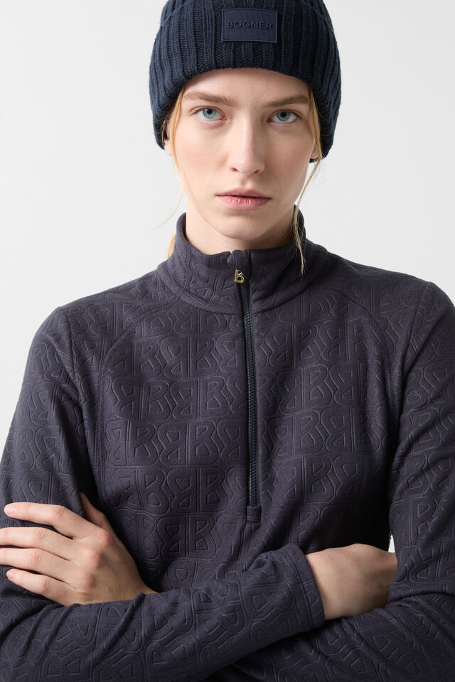 Лого на BOGNER, деликатно позиционирано на нивото на ключицата