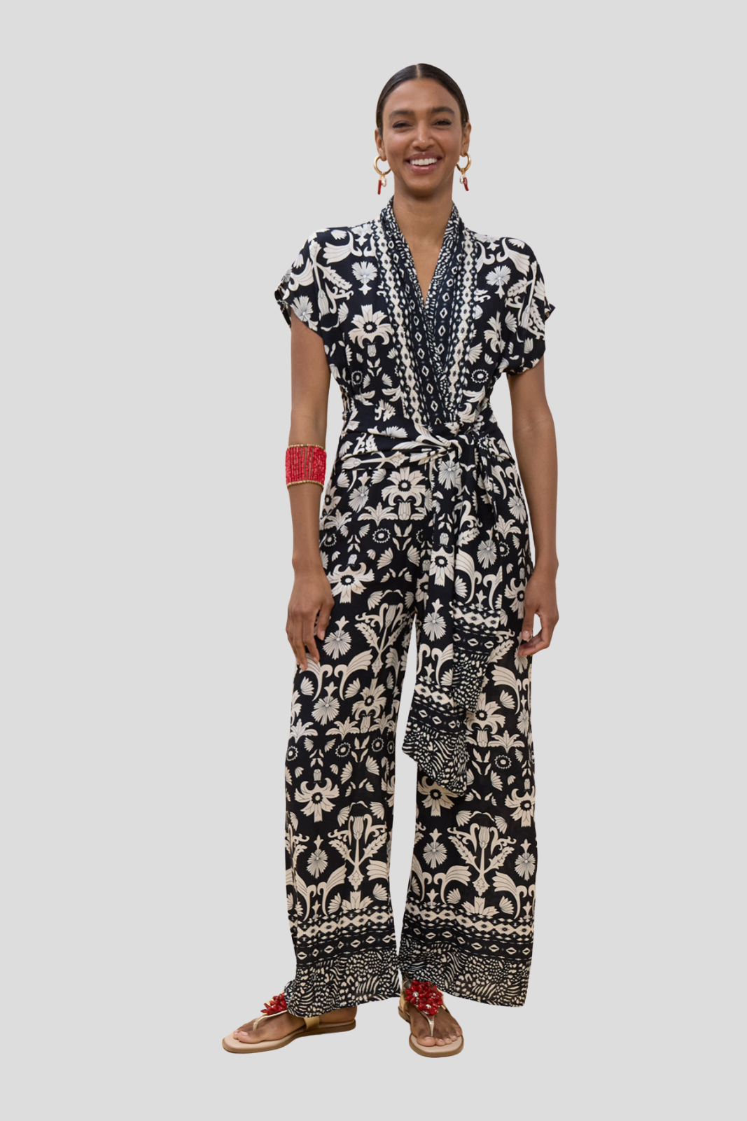 Късите ръкави и широките крачоли създават усещане за непринудена изтънченост, превръщайки модела в съвършен избор за градска или вечерна визия на високо ниво