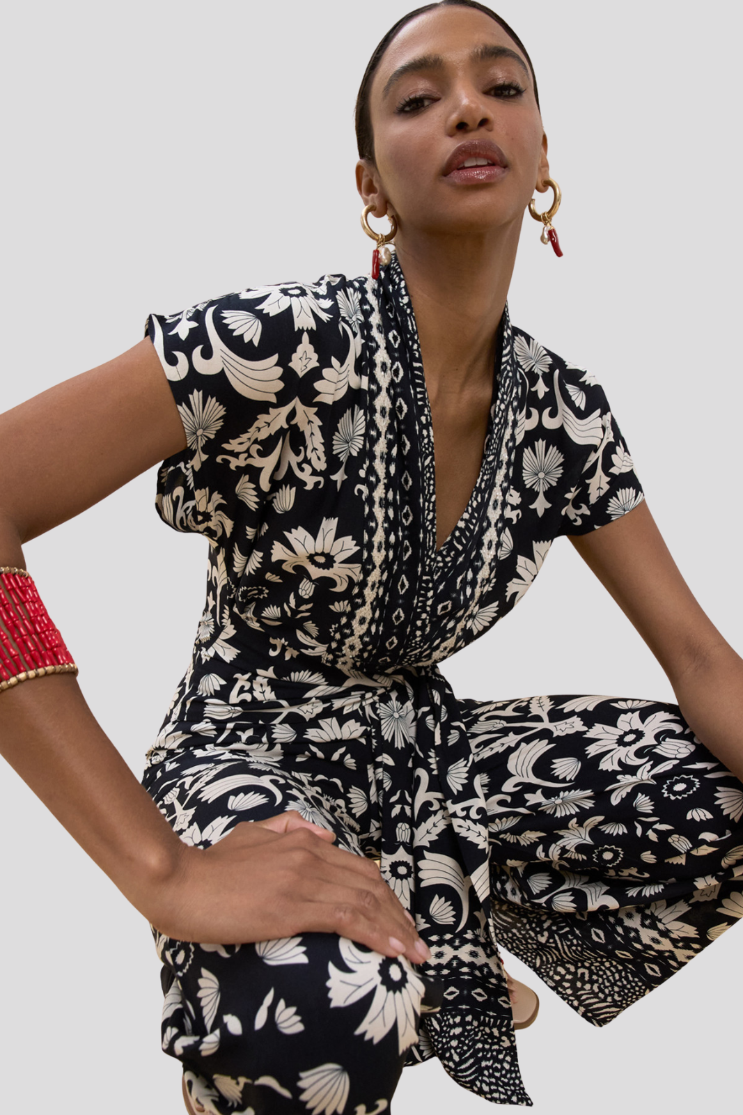 Дълъг гащеризон в класически силует изключителен етно принт в изтънчени неутрални нюанси, излъчващ съвременна грация и характер