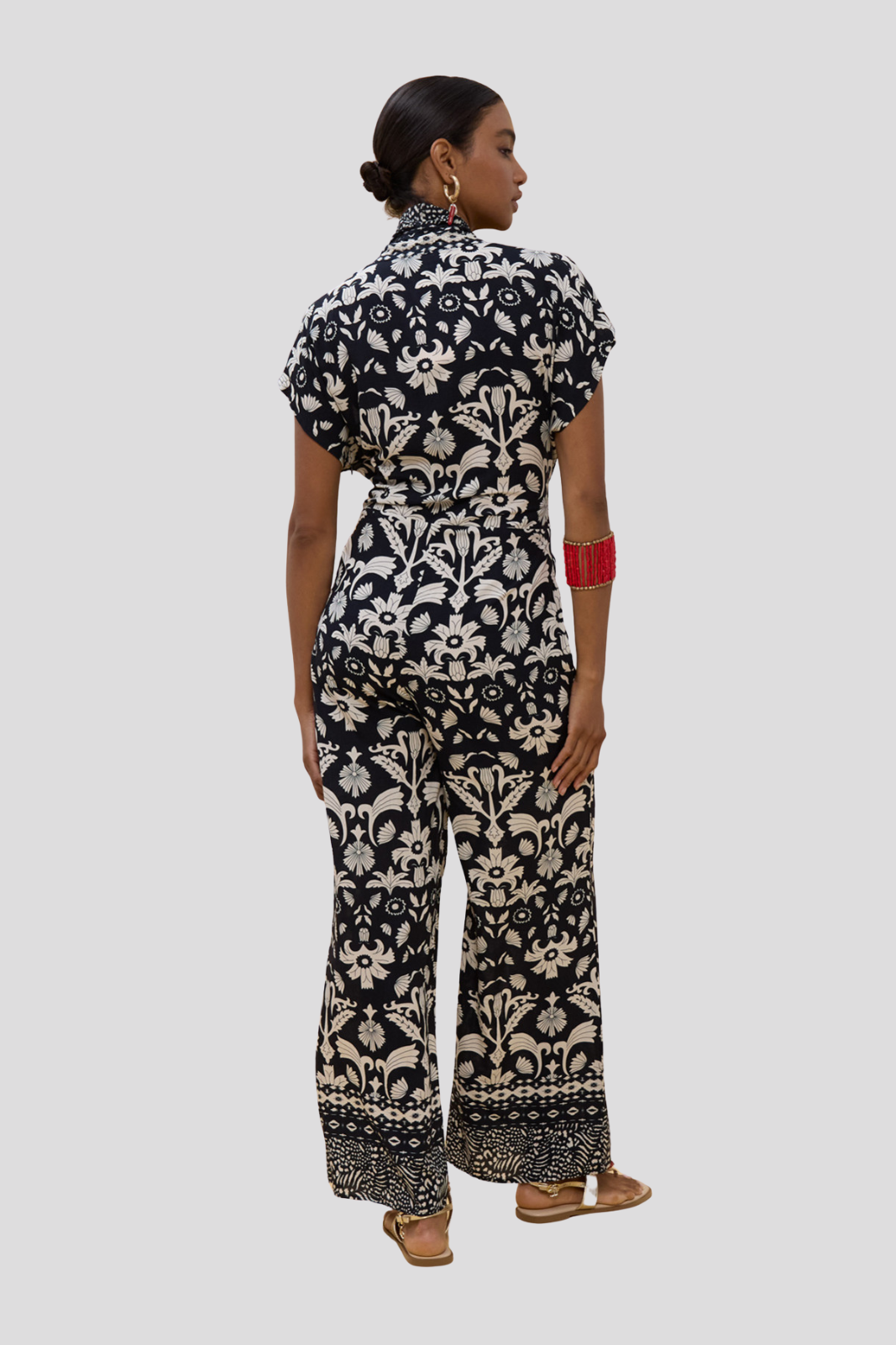 Късите ръкави и широките крачоли създават усещане за непринудена изтънченост, превръщайки модела в съвършен избор за градска или вечерна визия на високо ниво