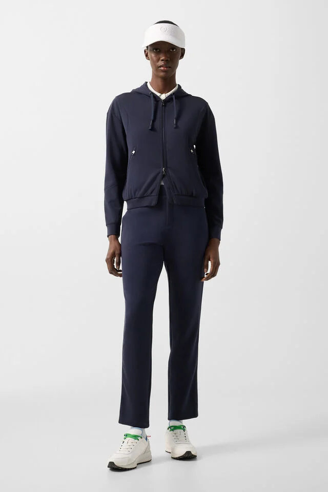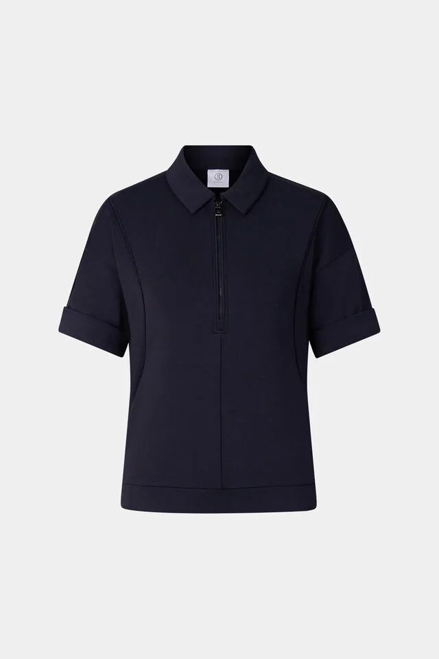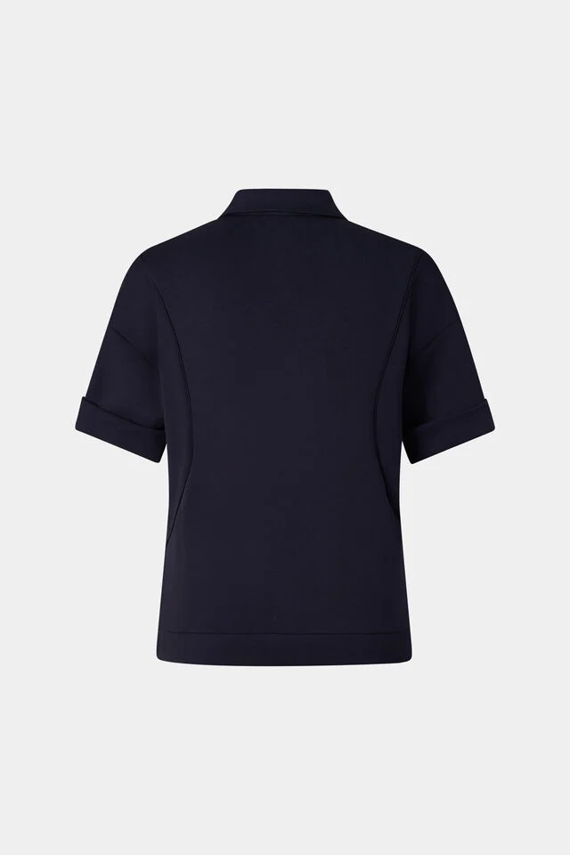 Дамски пуловер в класически силует с права висока яка, дълги ръкави с двойно зашити маншети, закопчаване с B-цип, ленти с гумени лога, поставени отстрани