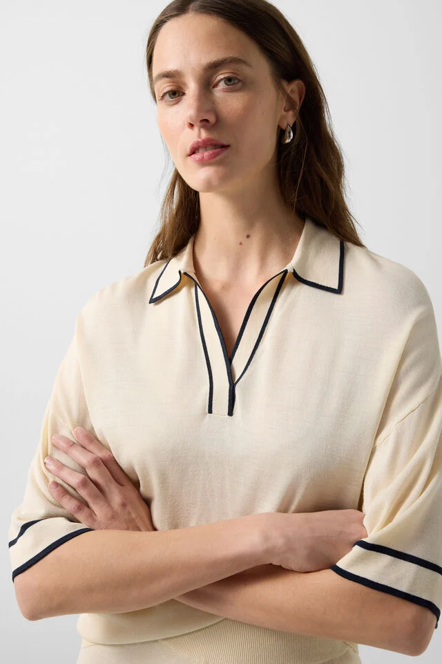 Поло блуза оувърсайз в класически силует , подчертана с изтънчено V-образно деколте и оребрена поло яка