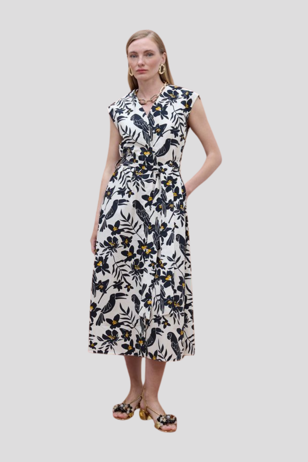 Дамска елегантна рокля в прав силует с принт папагалови листа