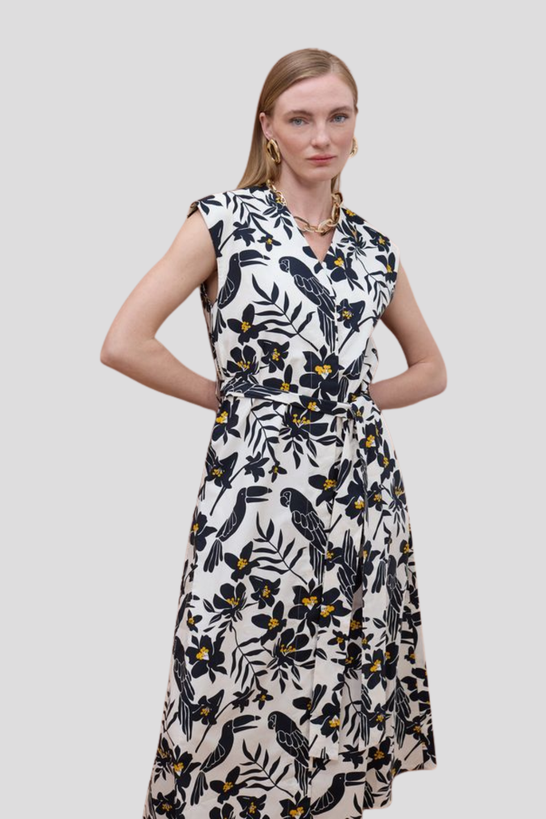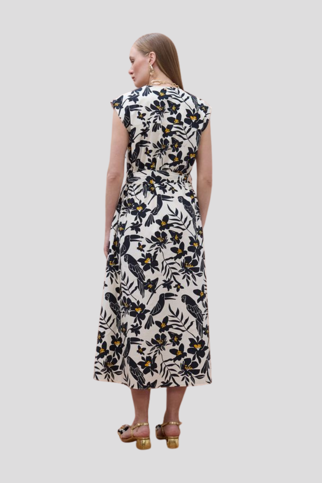 Дамска елегантна рокля в прав силует с принт папагалови листа