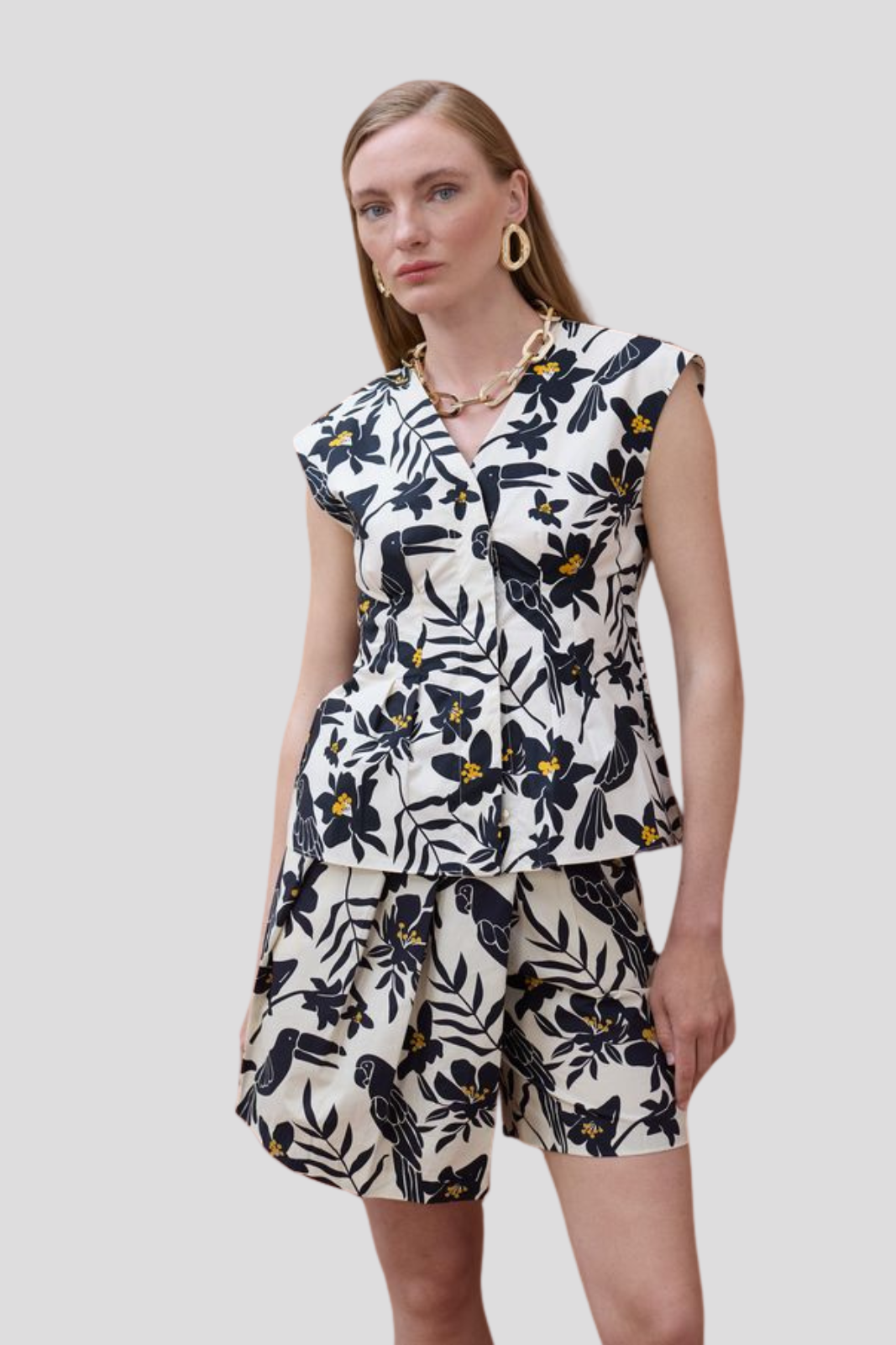 Дамски топ с прав силует, обогатен с елегантен тропически мотив — съчетание на лекота, свежест и модерна естетика