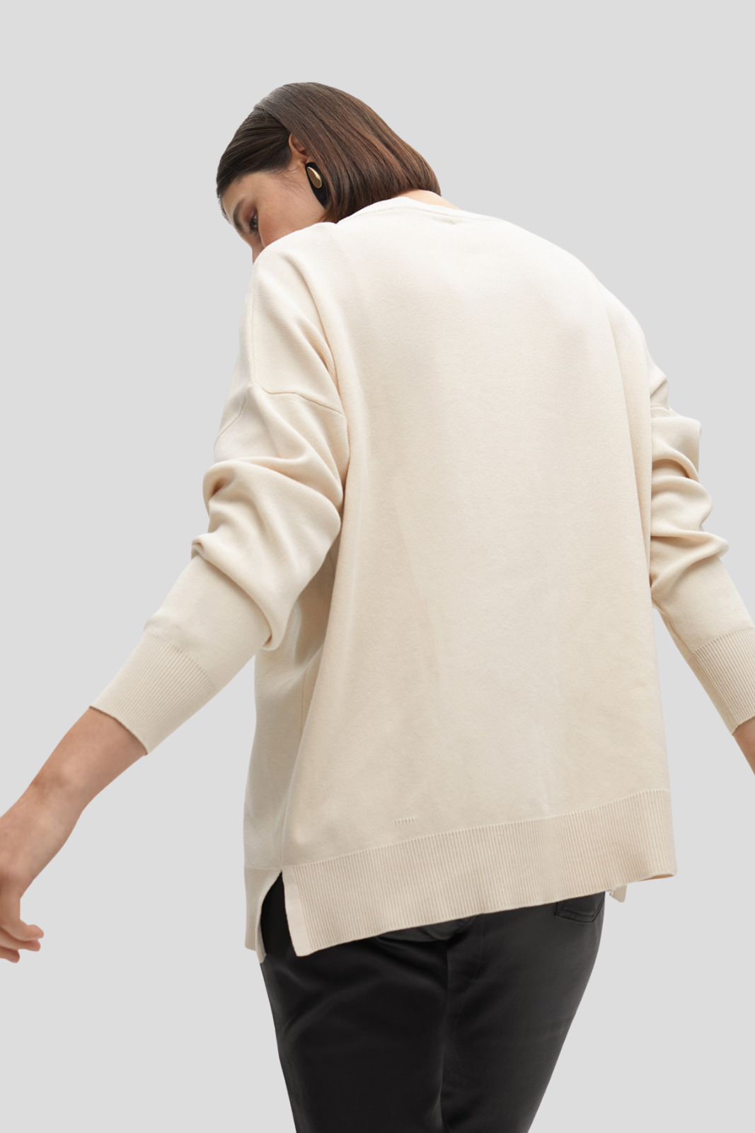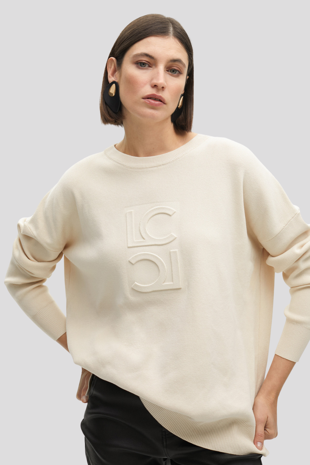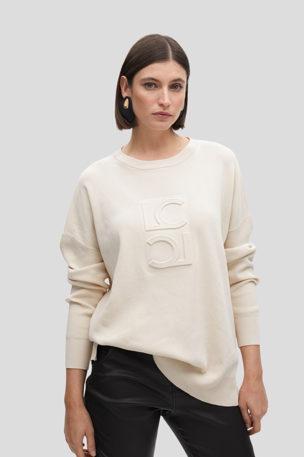 Мек вълнен пуловер с обло деколте и изискан релефен лого детайл
