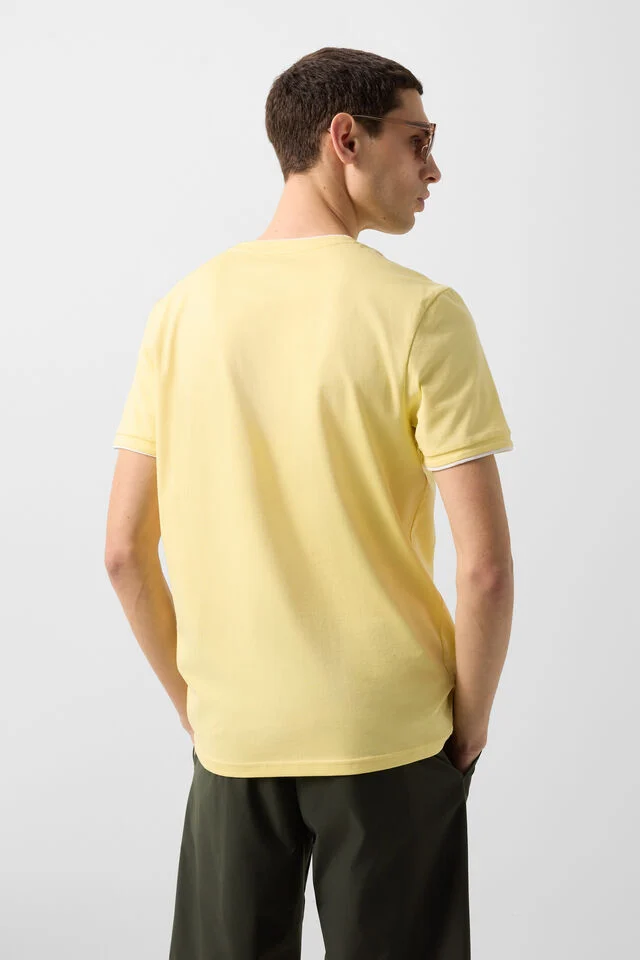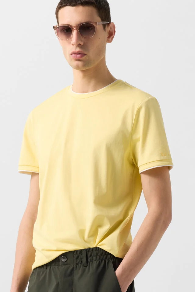 Тениска в класически силует, кръгла врата и многопластов дизайн, къси ръкави с вградени маншети в същия многопластов стил