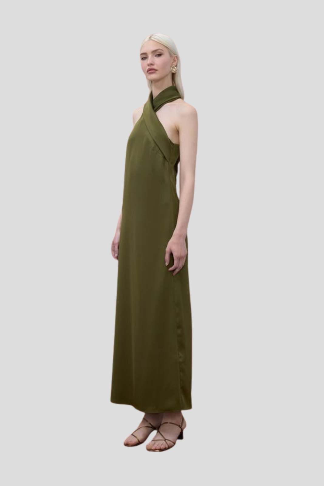 Рокля от луксозен сатен с изискано халтер деколте, излъчваща елегантност и съвременен шик