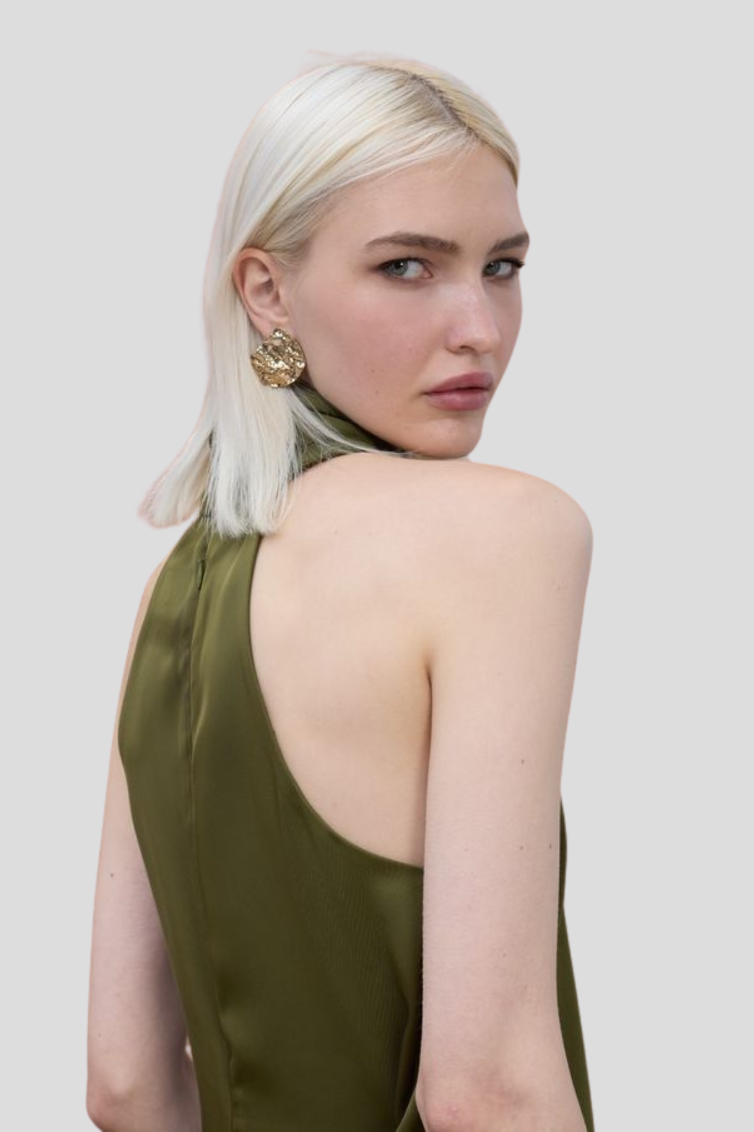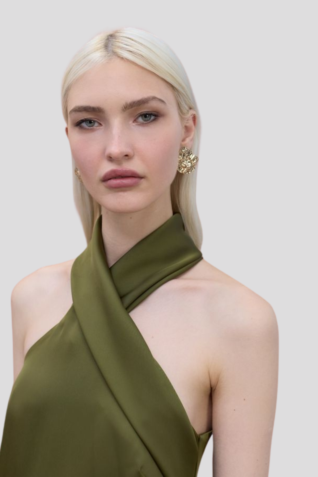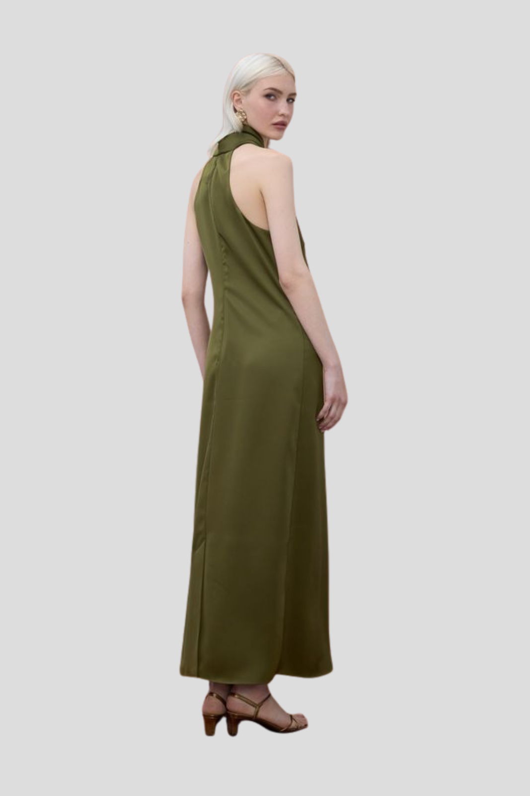 Рокля от луксозен сатен с изискано халтер деколте, излъчваща елегантност и съвременен шик
