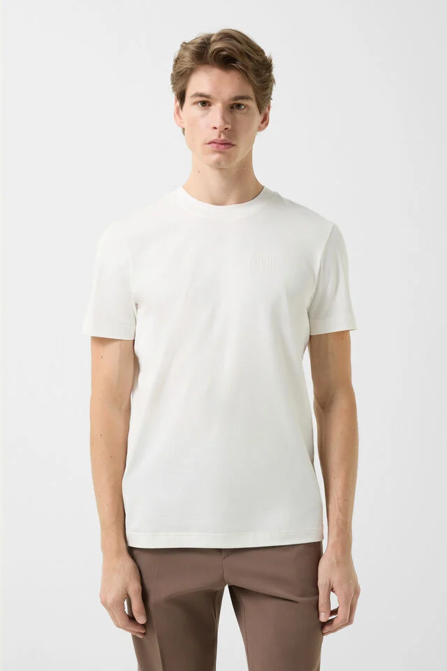 Приложен знак B е позициониран на височината на подгъва, а оребреният подгъв със странични цепки придава фин завършек и подчертава цялостната изтънченост на модела