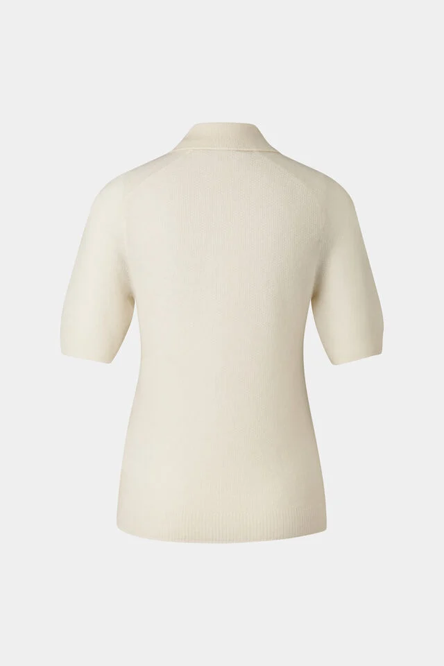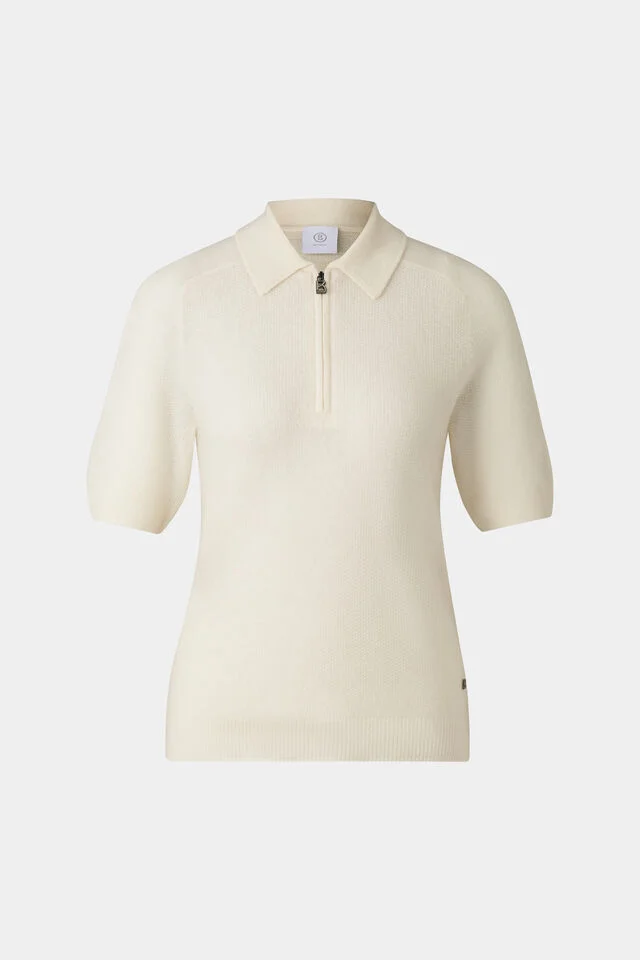 Плетен пуловер в класически силует, поло яка, къси ръкави тип реглан, оребрени маншети и закопчаване с B-цип