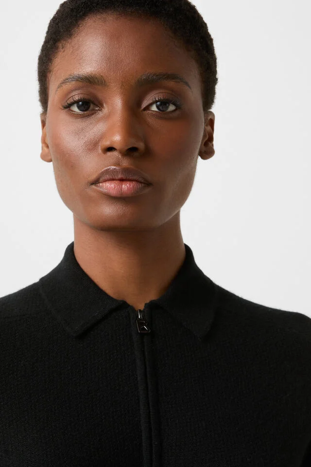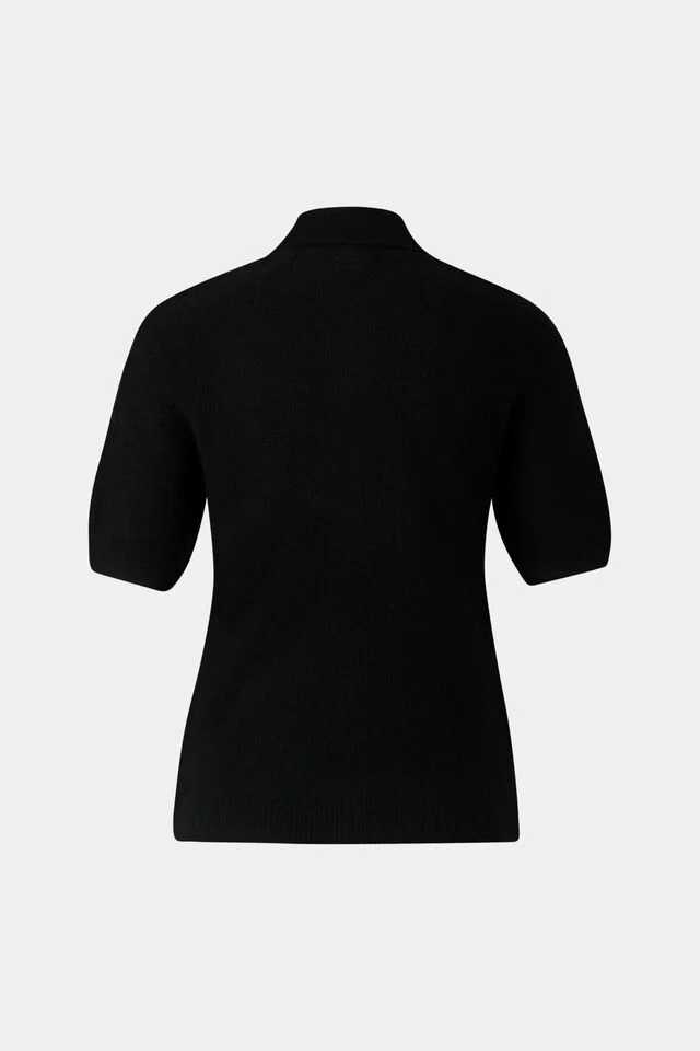 Плетен пуловер в класически силует, поло яка, къси ръкави тип реглан, оребрени маншети и закопчаване с B-цип