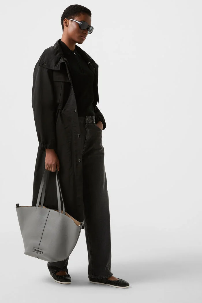 Приложен знак B е позициониран на височината на подгъва, а оребреният подгъв със странични цепки придава фин завършек и подчертава цялостната изтънченост на модела
