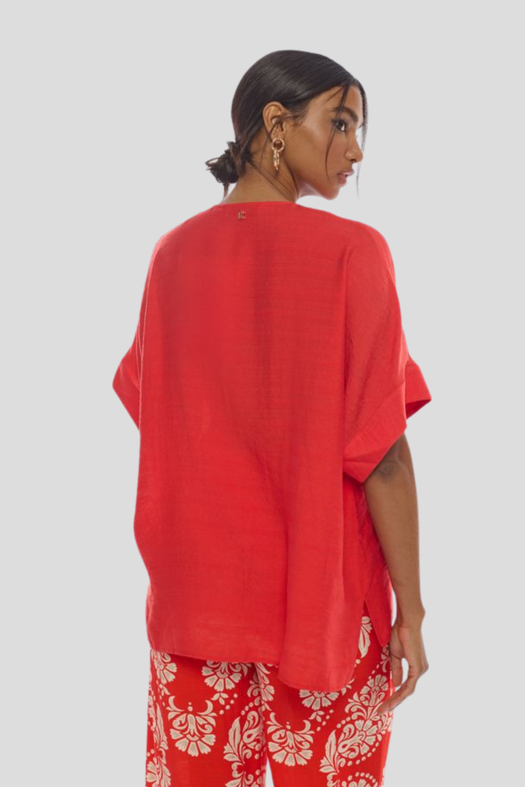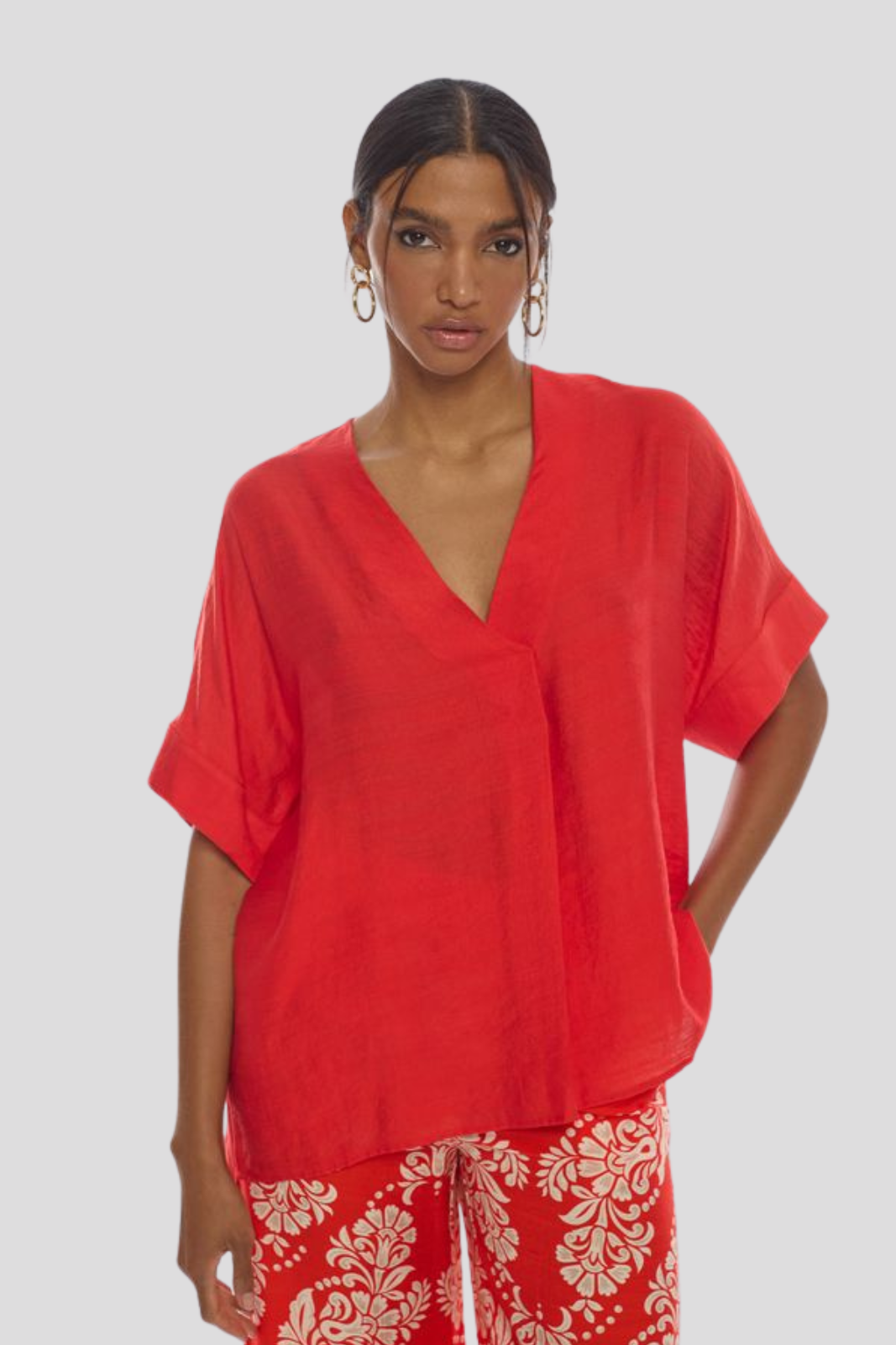 Блуза с къси ръкави и елегантно V-образно деколте, изработена с внимание към детайла и класически силует, излъчваща финес и модерна изтънченост.