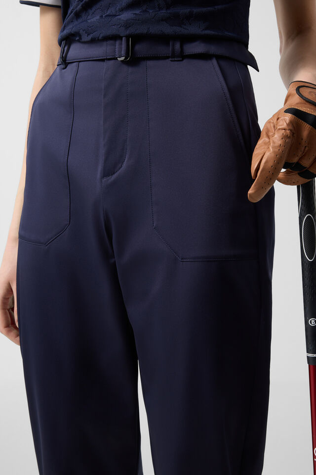 Закопчават се със скрита кука, копче и цип, а талията е подчертана с колан с двоен пръстен във формата на D