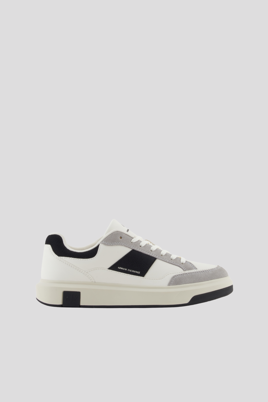 Двуцветната подметка с кремав междинен слой и грайфер допълва визията, докато логата на Armani Exchange, стратегически позиционирани върху страничната лента, езика и междинната подметка, потвърждават идентичността на марката