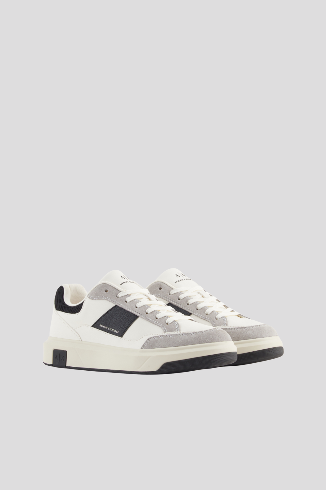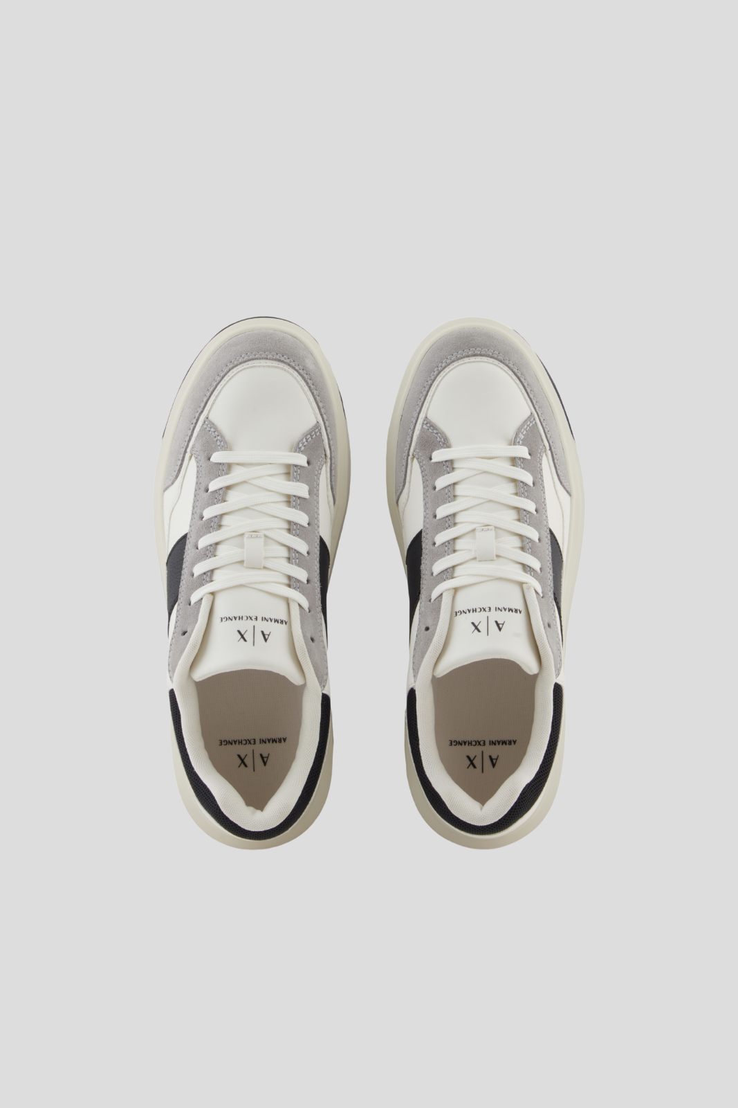 Двуцветната подметка с кремав междинен слой и грайфер допълва визията, докато логата на Armani Exchange, стратегически позиционирани върху страничната лента, езика и междинната подметка, потвърждават идентичността на марката