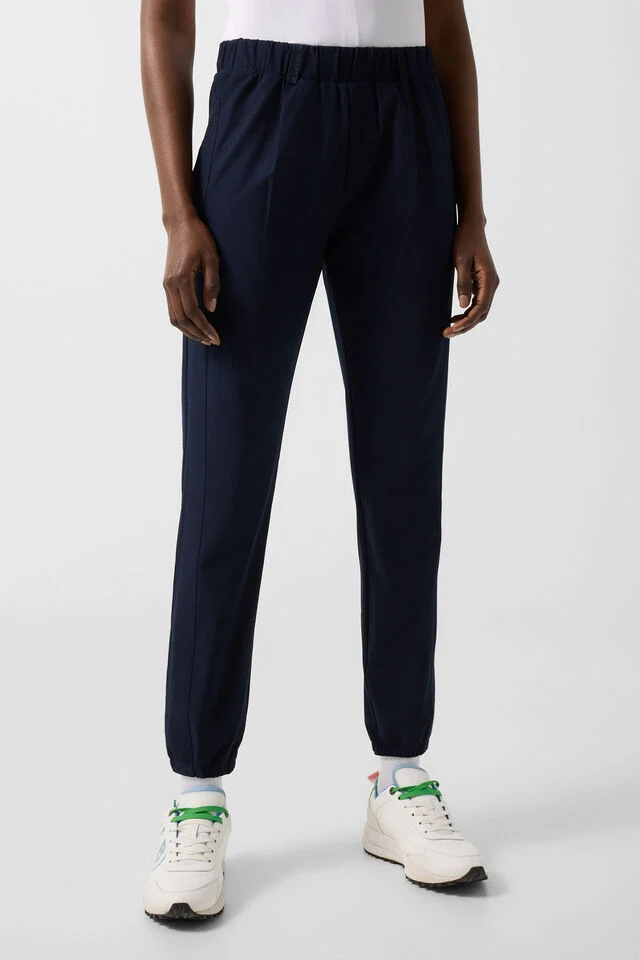 Леко стеснените крачоли и отворите с еластични ленти оформят модерна, динамична линия